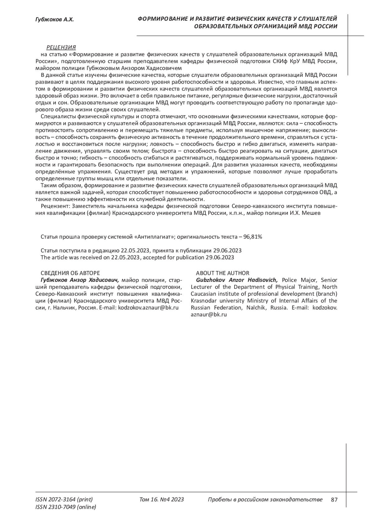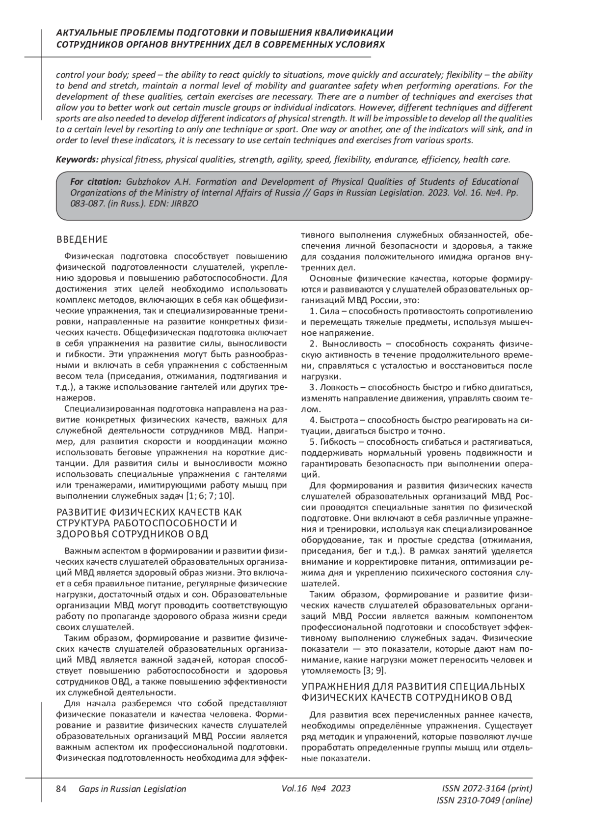 ГУБЖОКОВ А. Х. ФОРМИРОВАНИЕ И РАЗВИТИЕ ФИЗИЧЕСКИХ КАЧЕСТВ У СЛУШАТЕЛЕЙ ОБРАЗОВАТЕЛЬНЫХ ОРГАНИЗАЦИЙ МВД РОССИИ // ПРОБЕЛЫ В РОССИЙСКОМ ЗАКОНОДАТЕЛЬСТВЕ. 2023. Т. 16 № 4