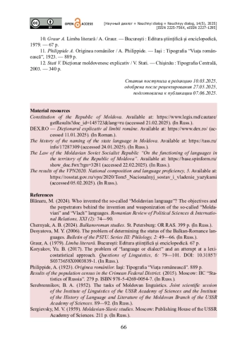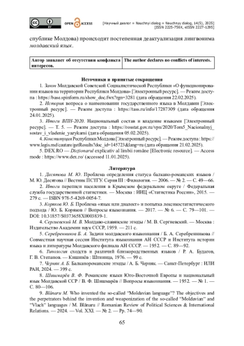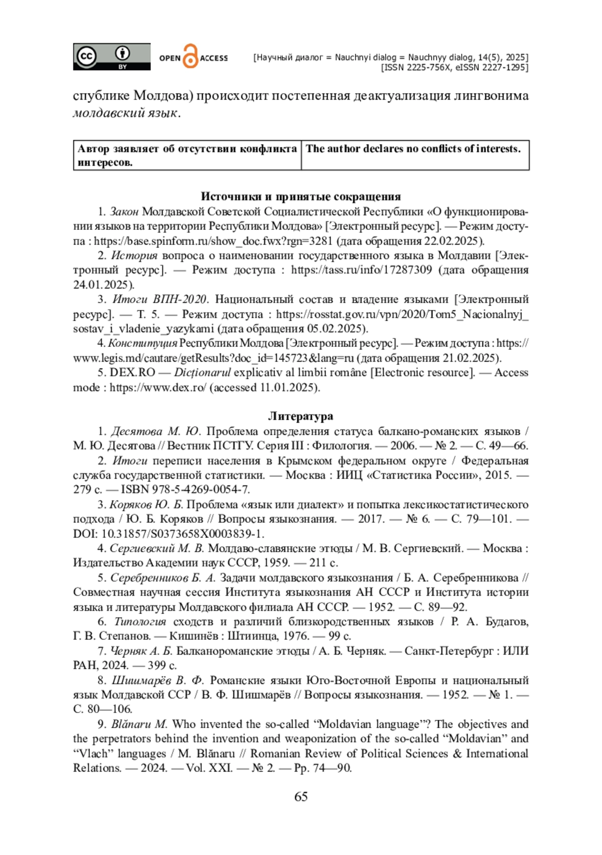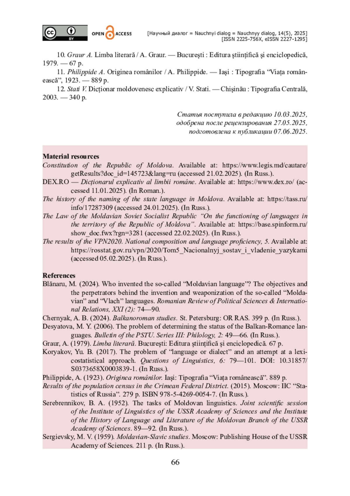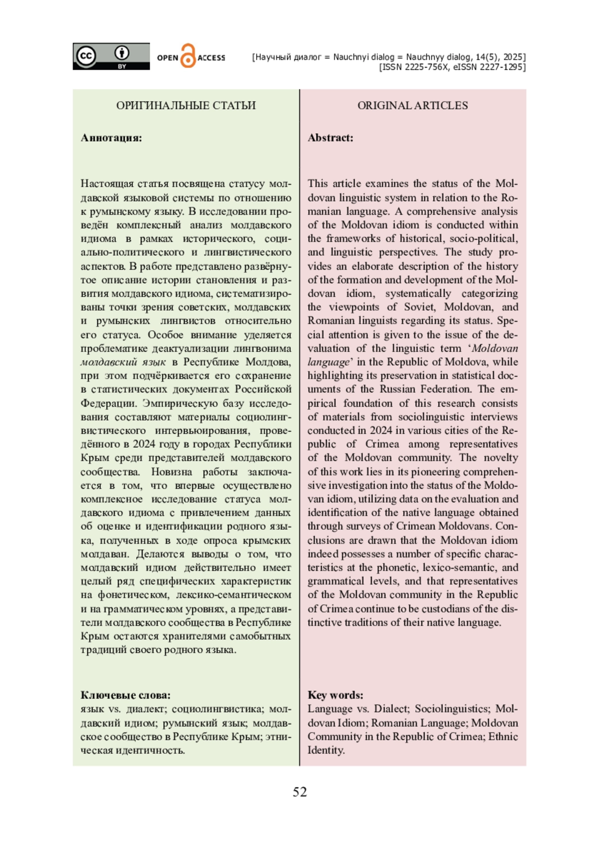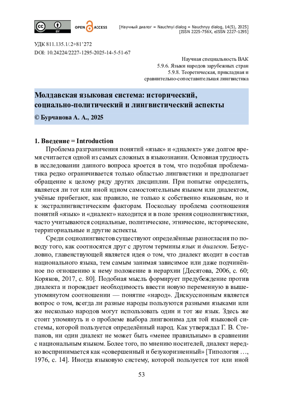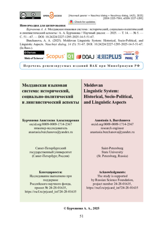 БУРЧАНОВА А. А. МОЛДАВСКАЯ ЯЗЫКОВАЯ СИСТЕМА: ИСТОРИЧЕСКИЙ, СОЦИАЛЬНО-ПОЛИТИЧЕСКИЙ И ЛИНГВИСТИЧЕСКИЙ АСПЕКТЫ // НАУЧНЫЙ ДИАЛОГ. 2025. ТОМ 14, № 5