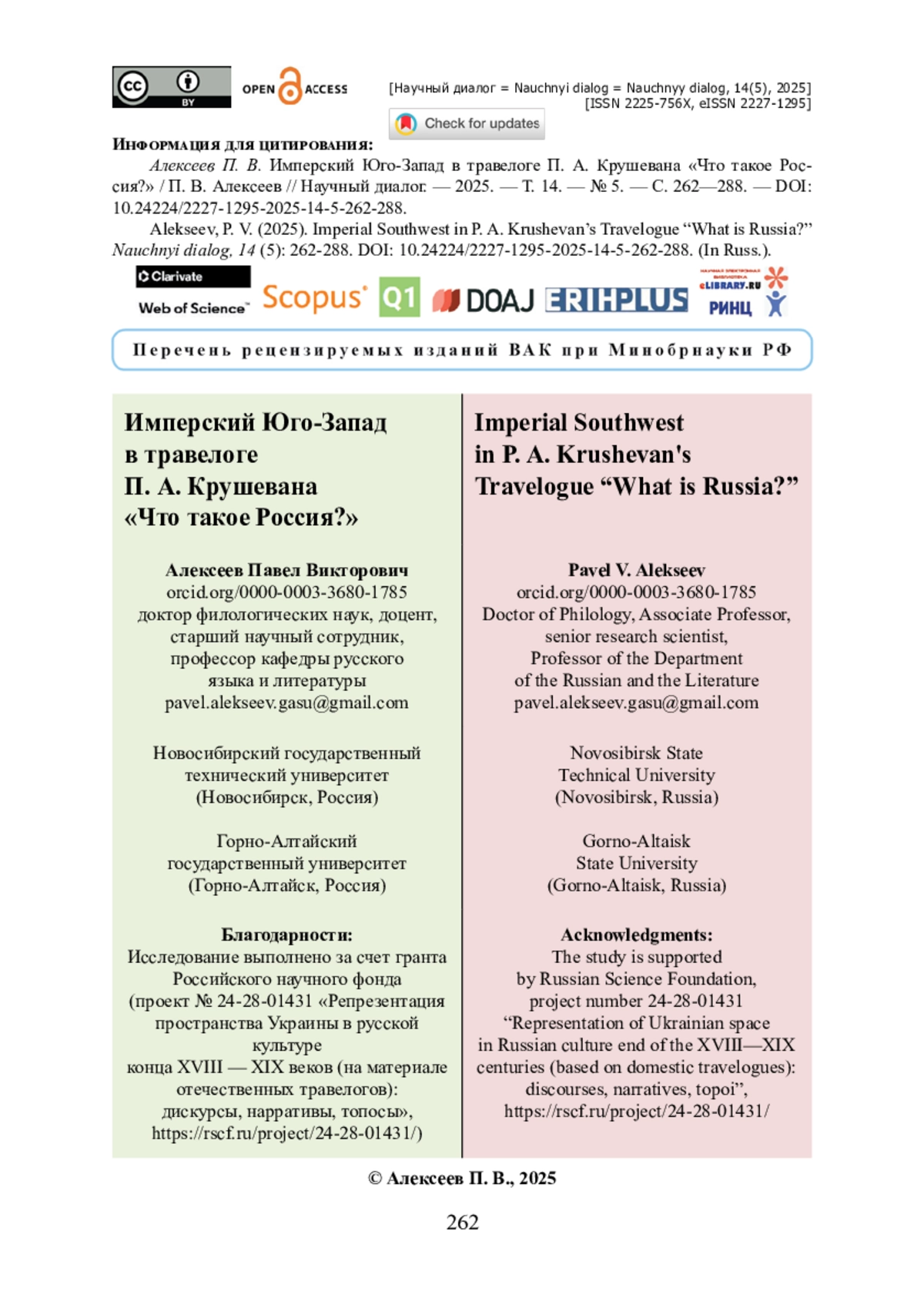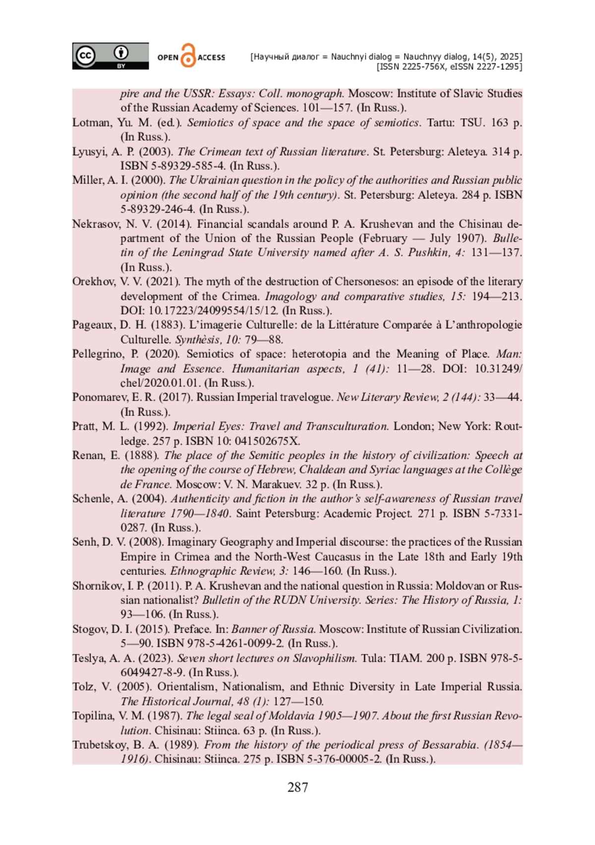 5. Галушко А. Д. «Свое» - «чужое» в описании Тавриды П. И. Сумароковым / А. Д. Галушко // Ученые записки Крымского федерального университета имени В. И. Вернадского. Филологические науки. - 2022. - Т. 8. - № 1. - С. 3-16.