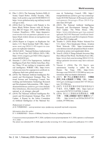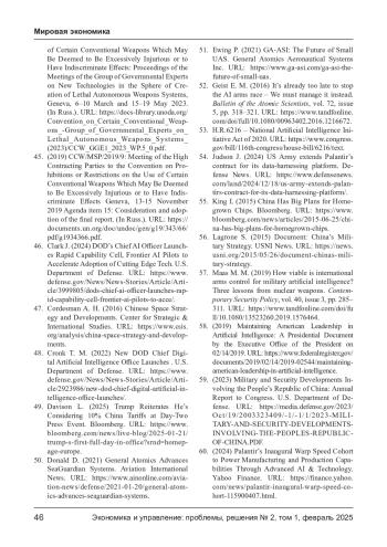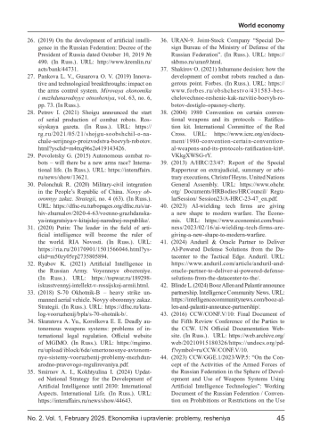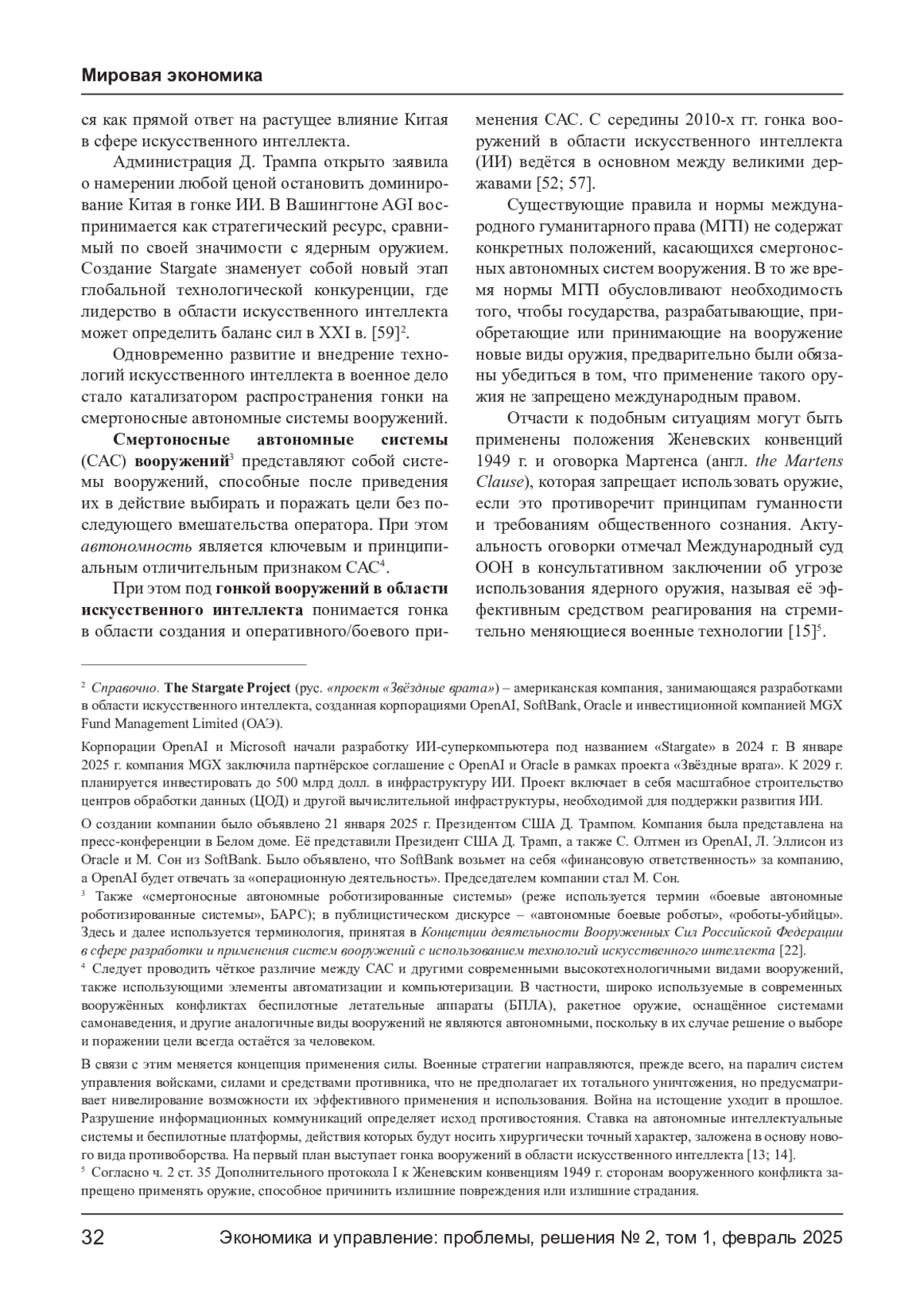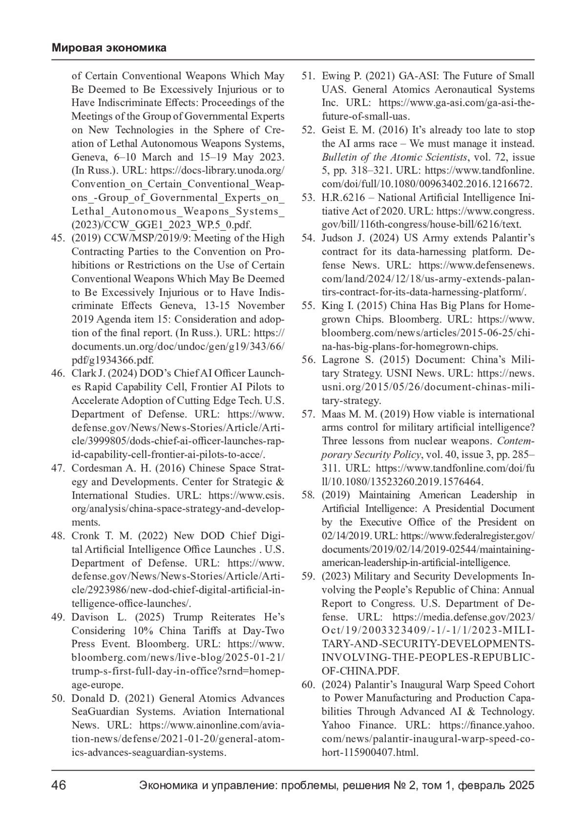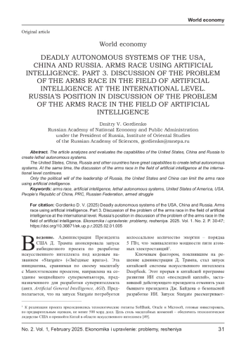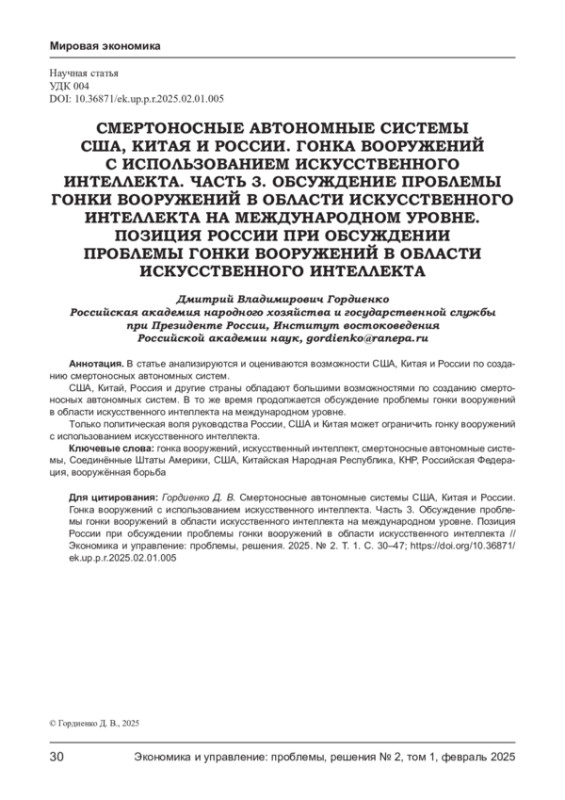 ГОРДИЕНКО Д. В. СМЕРТОНОСНЫЕ АВТОНОМНЫЕ СИСТЕМЫ США, КИТАЯ И РОССИИ. ГОНКА ВООРУЖЕНИЙ С ИСПОЛЬЗОВАНИЕМ ИСКУССТВЕННОГО ИНТЕЛЛЕКТА. ЧАСТЬ 3. ОБСУЖДЕНИЕ ПРОБЛЕМЫ ГОНКИ ВООРУЖЕНИЙ В ОБЛАСТИ ИСКУССТВЕННОГО ИНТЕЛЛЕКТА НА МЕЖДУНАРОДНОМ УРОВНЕ. ПОЗИЦИЯ РОССИИ ПРИ ОБСУЖДЕНИИ ПРОБЛЕМЫ ГОНКИ ВООРУЖЕНИЙ В ОБЛАСТИ ИСКУССТВЕННОГО ИНТЕЛЛЕКТА // ЭКОНОМИКА И УПРАВЛЕНИЕ: ПРОБЛЕМЫ, РЕШЕНИЯ. 2025. ТОМ 1 № 2