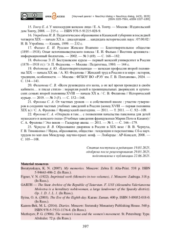 Ключевые фразы: КАЗАНСКАЯ ГУБЕРНИЯ, эго-документы, социальная повседневность, образование женщин, общественная деятельность женщин, труд женщин, дворянки