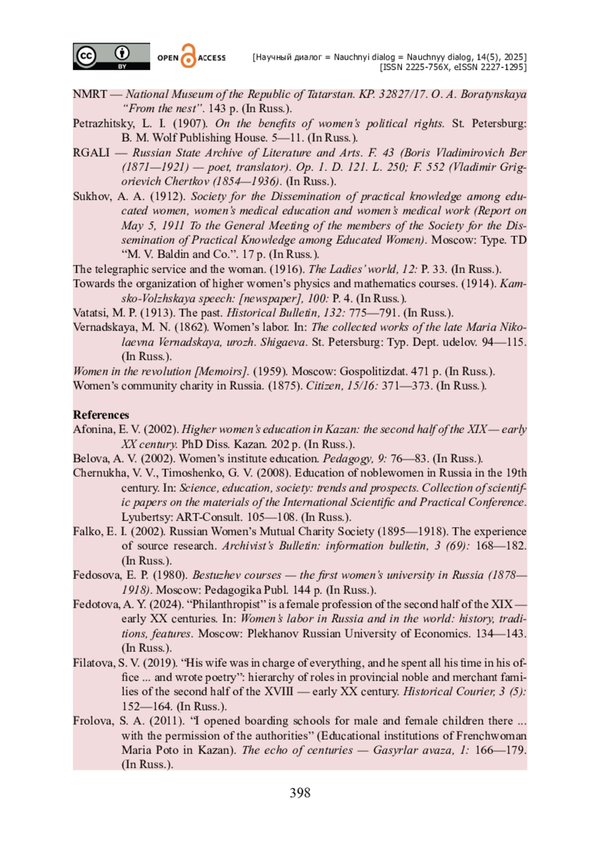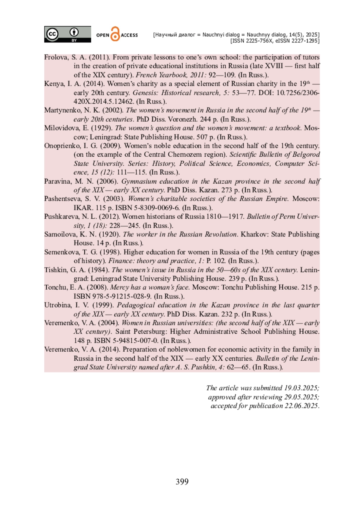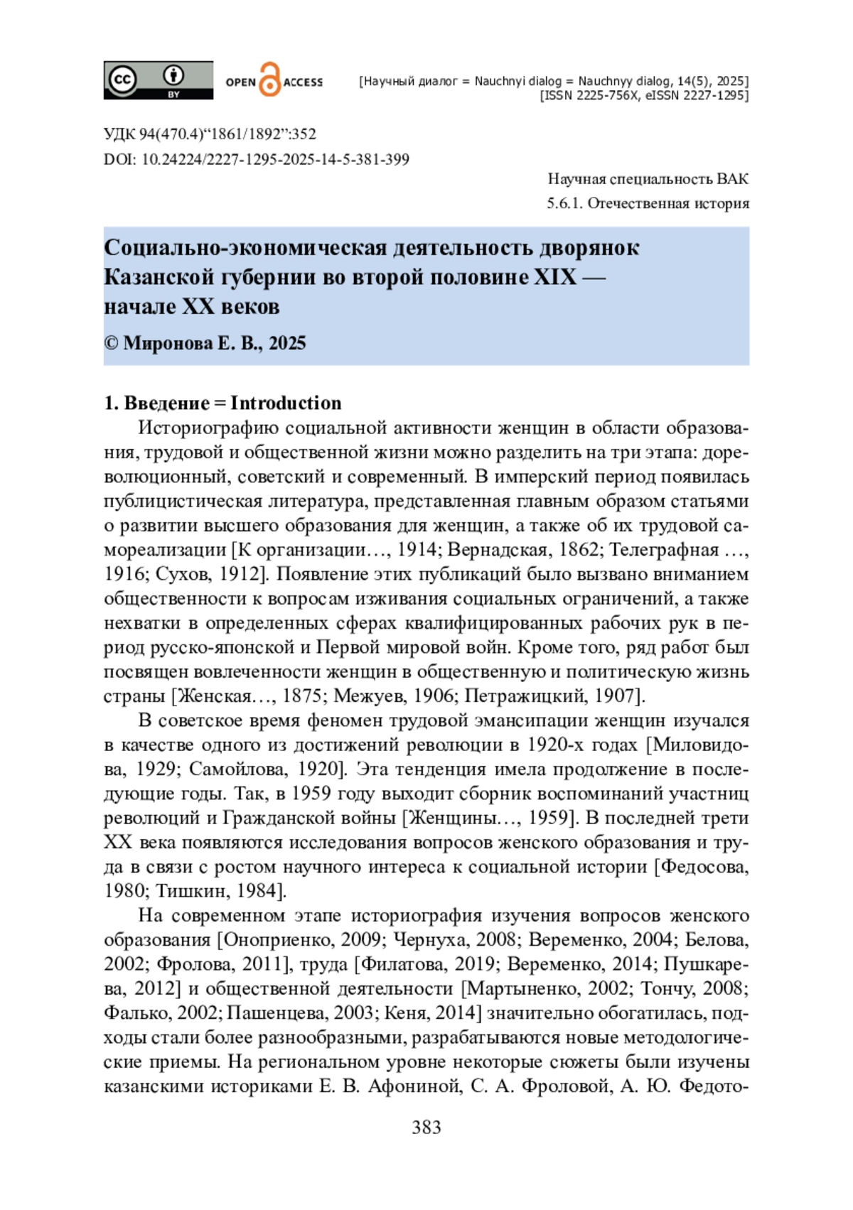 МИРОНОВА Е. В. СОЦИАЛЬНО-ЭКОНОМИЧЕСКАЯ ДЕЯТЕЛЬНОСТЬ ДВОРЯНОК КАЗАНСКОЙ ГУБЕРНИИ ВО ВТОРОЙ ПОЛОВИНЕ XIX — НАЧАЛЕ XX ВЕКОВ // НАУЧНЫЙ ДИАЛОГ. 2025. ТОМ 14, № 5