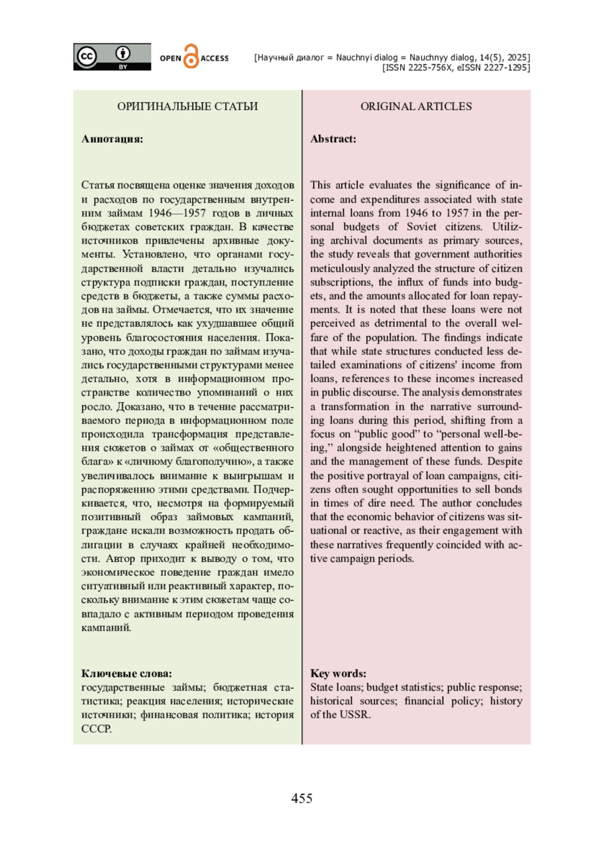 10. Новиков М. Д. Девиации в процессе проведения внутренних государственных займов 1946-1957 годов в СССР / М. Д. Новиков // Петербургский исторический журнал. - 2025. - № 1 (45). - С. 85-95. - https://doi.org/10.51255/2311-603X_2025_1_85.