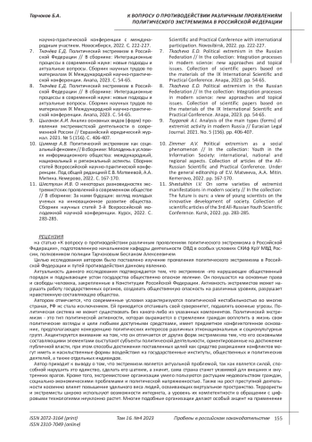 8. Ткачёва Е.Д. Политический экстремизм в Российской Федерации // В сборнике: Интеграционные процессы в современной науке: новые подходы и актуальные вопросы. Сборник научных трудов по материалам IX Международной научно-практической конференции. Анапа, 2023. С. 54-65. EDN: YAYWQJ