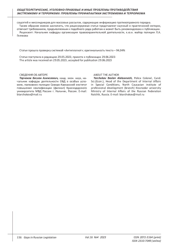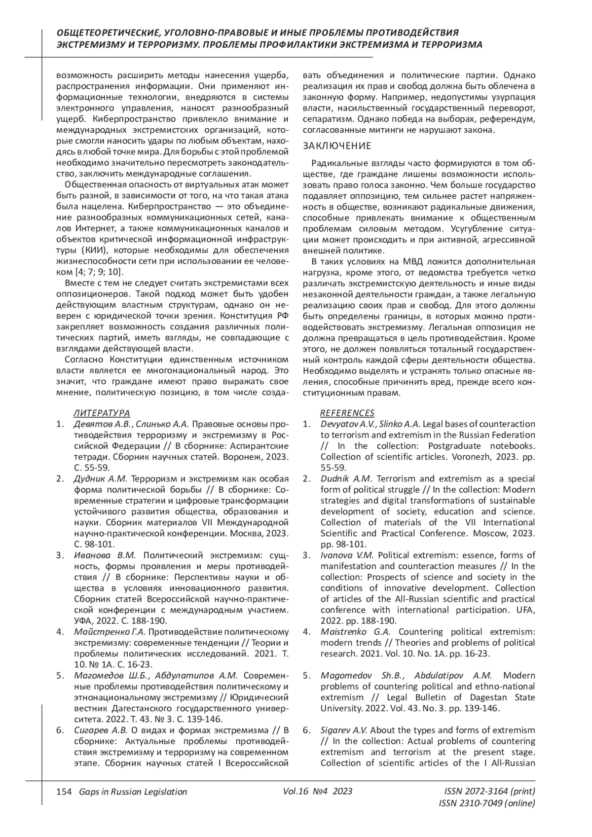 1. Девятов А.В., Слинько А.А. Правовые основы противодействия терроризму и экстремизму в Российской Федерации // В сборнике: Аспирантские тетради. Сборник научных статей. Воронеж, 2023. С. 55-59. EDN: OUZPLT