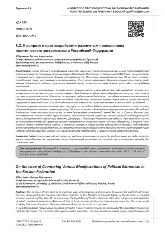 Tkacheva E.D. Political extremism in the Russian Federation // In the collection: Integration processes in modern science: new approaches and topical issues. Collection of scientific papers based on the materials of the IX International Scientific and Practical Conference. Anapa, 2023. pp. 54-65. EDN: YAYWQJ