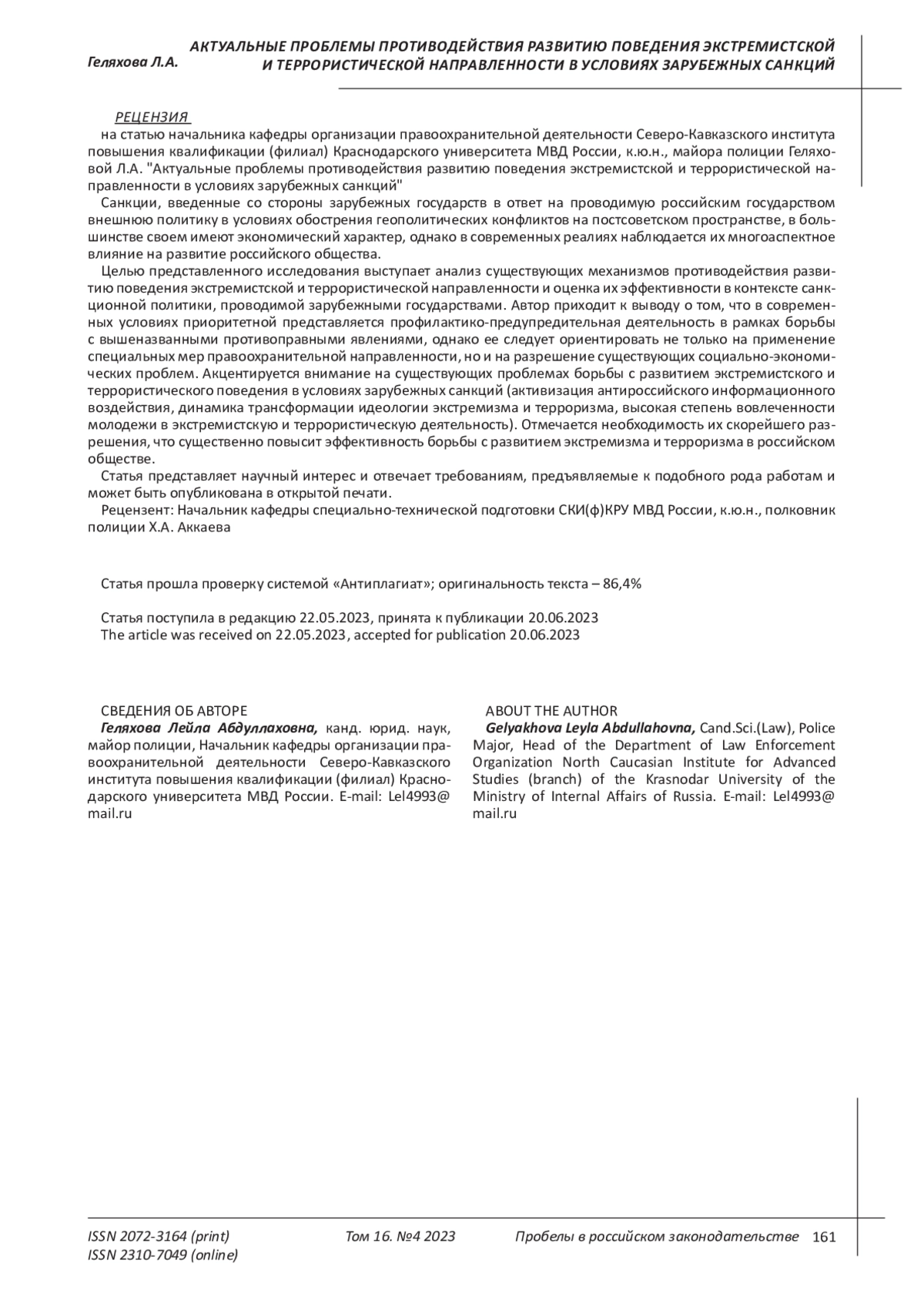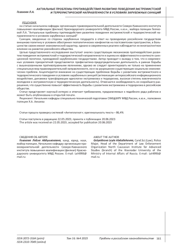 Санкции, введенные со стороны зарубежных государств в ответ на проводимую российским государством внешнюю политику в условиях обострения геополитических конфликтов на постсоветском пространстве, в большинстве своем имеют экономический характер, однако в современных реалиях наблюдается их многоаспектное влияние на развитие российского общества. Отдельные экономические кризисные ситуации, снижение уровня благосостояния населения, дефицит конкретных товаров и услуг - данные обстоятельства существенно способствуют росту социальной напряженности в обществе, которая выступает одним из основных факторов активизации распространения экстремистской и террористической идеологии. Учитывая тот факт, что за последние годы существенно увеличилось количество экстремистских преступлений и предотвращено достаточно много террористических актов, возникают вопросы об эффективности современных механизмов борьбы с экстремизмом и терроризмом в Российской Федерации. Целью представленного исследования выступает анализ существующих механизмов противодействия развитию поведения экстремистской и террористической направленности и оценка их эффективности в контексте санкционной политики, проводимой зарубежными государствами. Автор приходит к выводу о том, что в современных условиях приоритетной представляется профилактико-предупредительная деятельность в рамках борьбы с вышеназванными противоправными явлениями, однако ее следует ориентировать не только на применение специальных мер правоохранительной направленности, но и на разрешение существующих социально-экономических проблем. Акцентируется внимание на существующих проблемах борьбы с развитием экстремистского и террористического поведения в условиях зарубежных санкций (активизация антироссийского информационного воздействия, динамика трансформации идеологии экстремизма и терроризма, высокая степень вовлеченности молодежи в экстремистскую и террористическую деятельность). Отмечается необходимость их скорейшего разрешения, что существенно повысит эффективность борьбы с развитием экстремизма и терроризма в российском обществе.