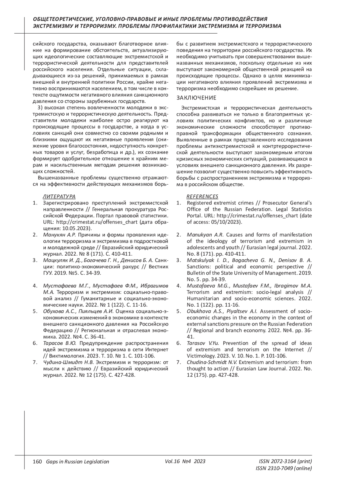 2. Манукян А.Р. Причины и формы проявления идеологии терроризма и экстремизма в подростковой и молодежной среде // Евразийский юридический журнал. 2022. № 8 (171). С. 410-411. EDN: OUEXXA