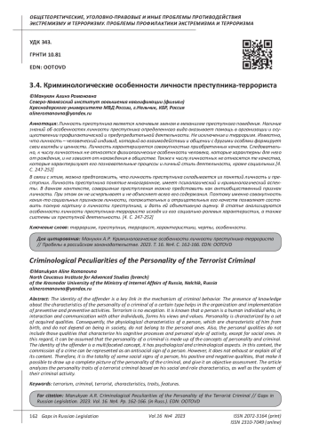 Статья: КРИМИНОЛОГИЧЕСКИЕ ОСОБЕННОСТИ ЛИЧНОСТИ ПРЕСТУПНИКА-ТЕРРОРИСТА (2023)