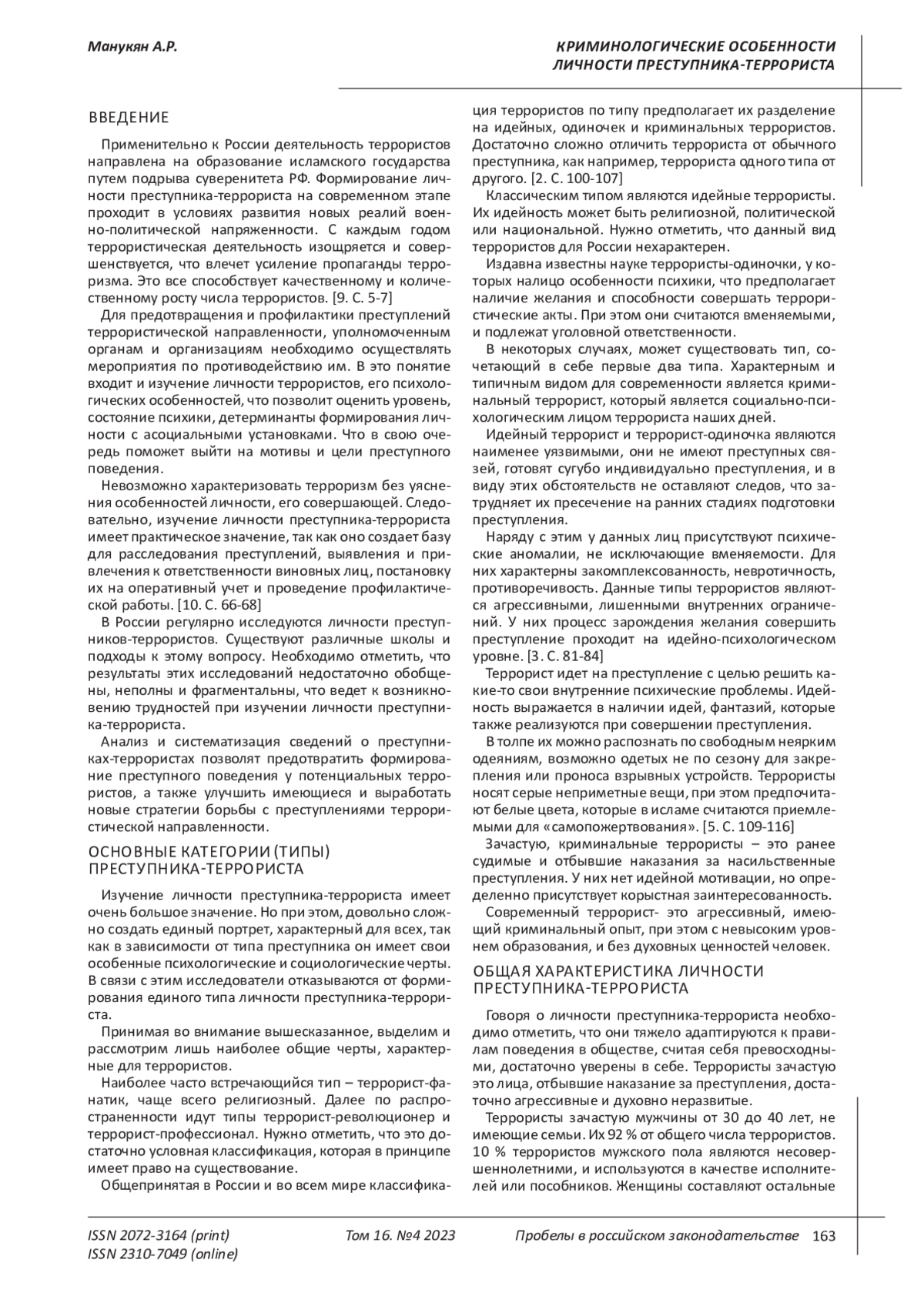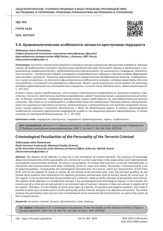 МАНУКЯН А. Р. КРИМИНОЛОГИЧЕСКИЕ ОСОБЕННОСТИ ЛИЧНОСТИ ПРЕСТУПНИКА-ТЕРРОРИСТА // ПРОБЕЛЫ В РОССИЙСКОМ ЗАКОНОДАТЕЛЬСТВЕ. 2023. Т. 16 № 4