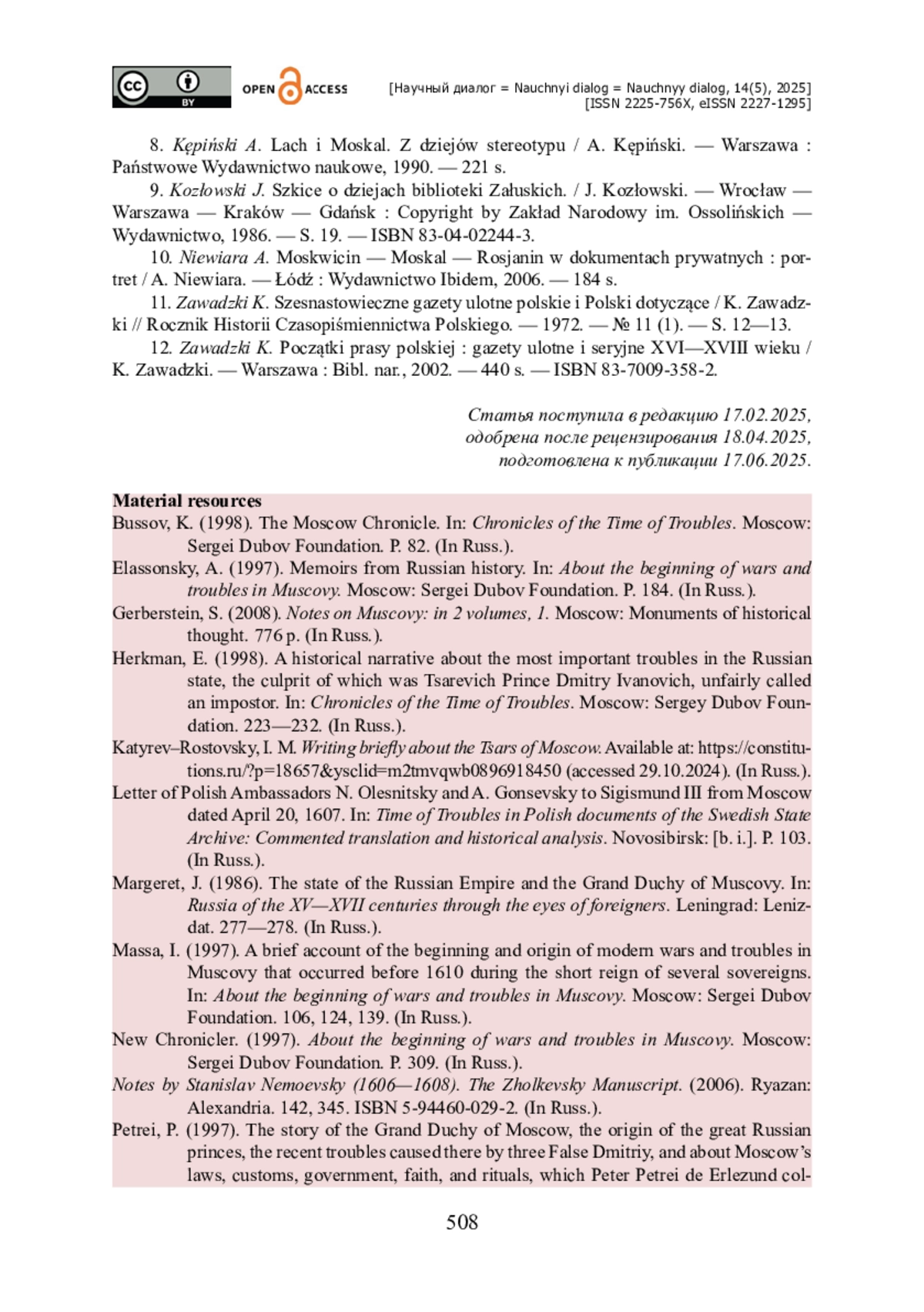 Проведено исследование информационной войны и пропаганды Речи Посполитой против Московского государства в Смутное время. В качестве иллюстрации дан ной проблемы рассматривается польский новостной листок» 1609 года «Песнь о тирании Шуйского» из фондов Российской национальной библиотеки. Полный пере вод «Песни…» на русский язык впервые выполнен автором статьи. Установлено, что данное произведение написано польским мещанским поэтом Адамом Владиславским (Вроцлавчиком). Отмечается, что «Песнь…» призвана была убедить жителей Речи Посполитой в справедливости похода короля Сигизмунда III под Смоленск. Про водится анализ представлений о личности царя Василия Шуйского в произведениях его современников. Проведено сравнение свидетельств современников (иностранных и российских) с текстом «Песни о тирании Шуйского». Сделан вывод, что личность царя в «Песни…» демонизирована в пропагандистских целях. Подчеркивается, что из польско-литовских «новостных листков» культурно-политические стереотипы представлений о московских правителях и русском народе переходят на общеевропейский уровень, где остаются на протяжении последующих веков. Отмечается, что отголоски данных стереотипов мы наблюдаем в западной пропаганде и по сегодняшний день.