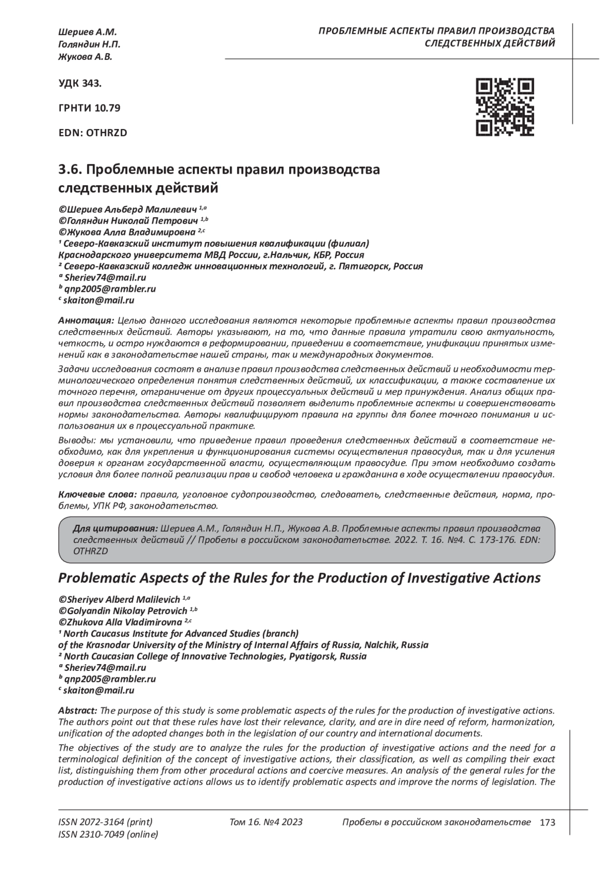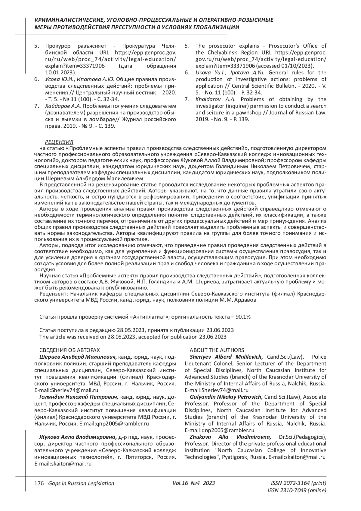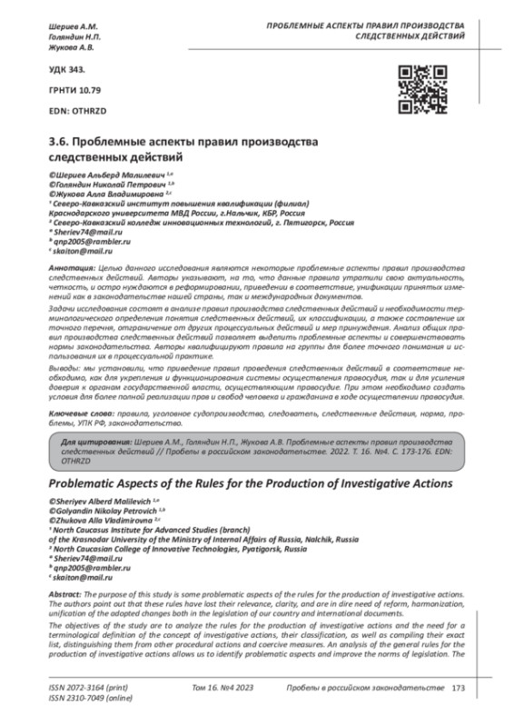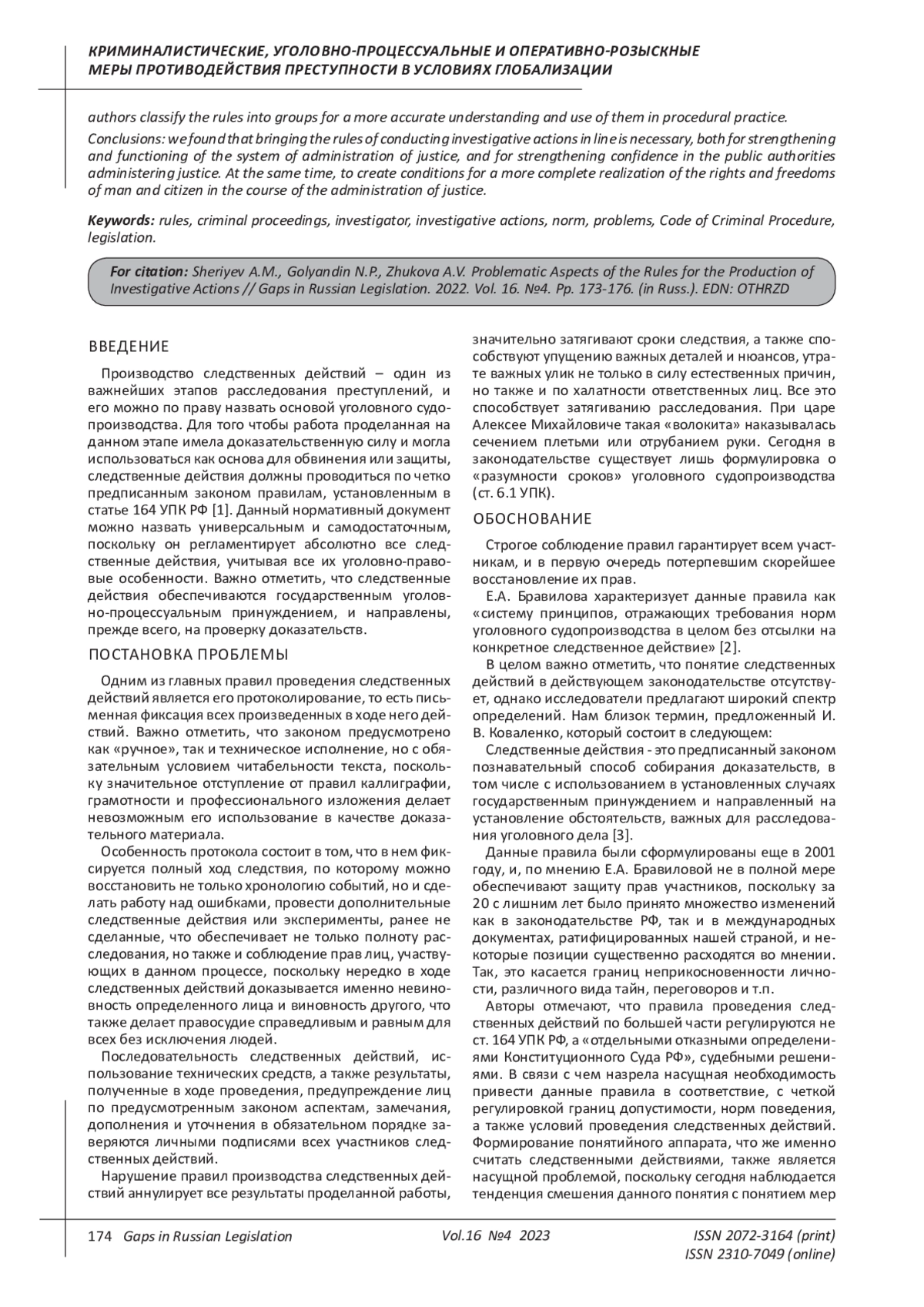 ШЕРИЕВ А. М., ЖУКОВА А. В., ГОЛЯНДИН Н. П. ПРОБЛЕМНЫЕ АСПЕКТЫ ПРАВИЛ ПРОИЗВОДСТВА СЛЕДСТВЕННЫХ ДЕЙСТВИЙ // ПРОБЕЛЫ В РОССИЙСКОМ ЗАКОНОДАТЕЛЬСТВЕ. 2023. Т. 16 № 4
