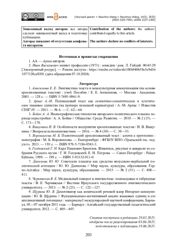 4. Вашунина И. В. Особенности восприятия креолизованных текстов / И. В. Вашунина // Вопросы психолингвистики. - 2016. - № 4 (30) - C. 39-53.