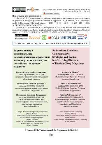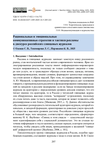 В статье анализируются коммуникативные стратегии и тактики рекламы в дискурсе российских глянцевых журналов как основа оказываемого воздействия и как проявление системы ценностей дискурса глянцевых журналов. Цель работы — выявление и описание стратегий и тактик воздействия и реализации идеалоформирующей функции рекламы в медиатекстах современных российских глянцевых журналов. Методологической базой выступили лингвостилистический, лингвопрагматический и социокоммуникативный подходы. Анализ рекламных текстов позволяет авторам сделать выводы о значимости базовых ценностей дискурса глянцевых журналов в выстраивании стратегий воздействия на читателей. Материалом эмпирического анализа послужили 100 современных рекламных текстов, опубликованных в популярных российских глянцевых журналах за 2023—2024 годы. Установлено количественное преобладание эмоциональных стратегий воздействия над рациональными и комбинированными в рекламе российских глянцевых журналов. Подтверждена идея о том, что языковые средства рекламного текста в соотношении с изобразительными средствами глянцевой рекламы воздействуют на читателя не столько понятийно, сколько образно и эмоционально, формируя при этом образ носителя ценностей глянцевого издания, заложенный адресантом рекламного текста.