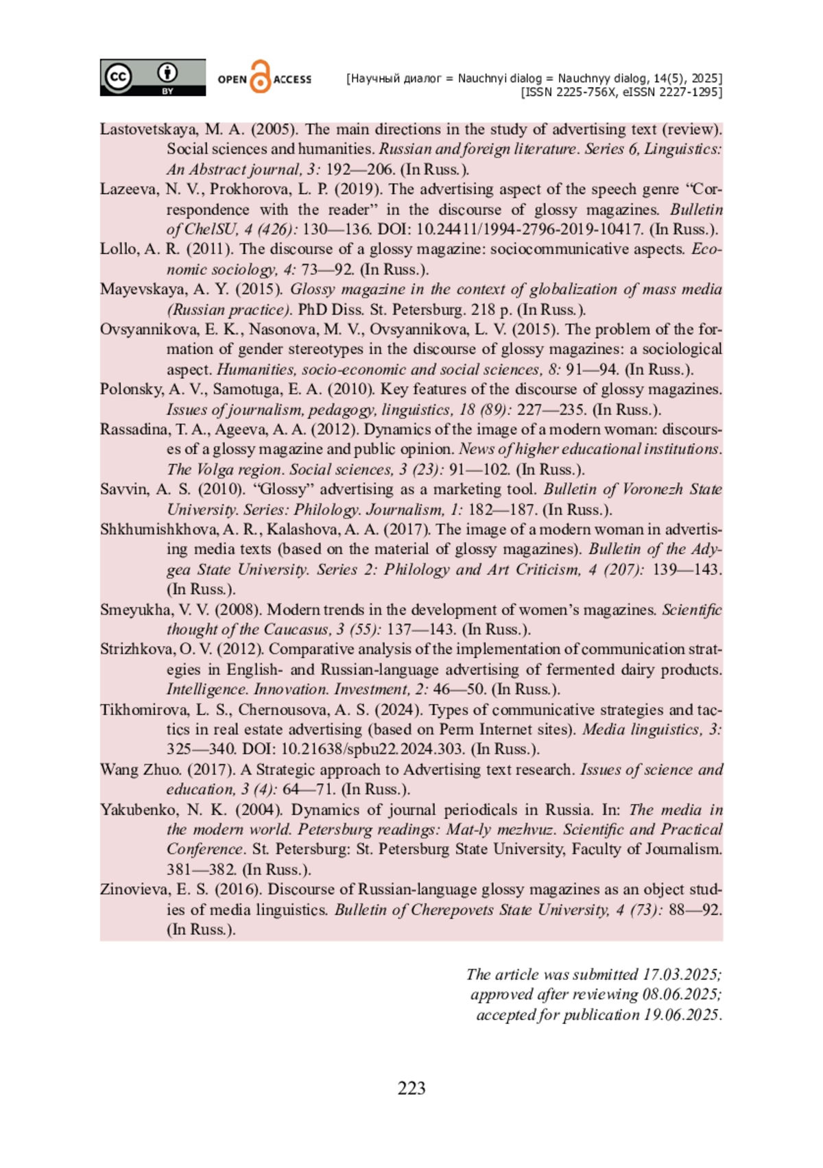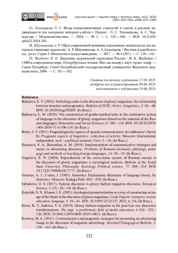 1. Бакалова Е. В. Переключения кодов в дискурсе глянцевых журналов: взаимосвязь структуры и прагматики / Е. В. Бакалова // Вестник ЮУрГУ. Серия: Лингвистика. - 2023. - № 2. - С. 62-68. - https://doi.org/10.14529/ling230209.