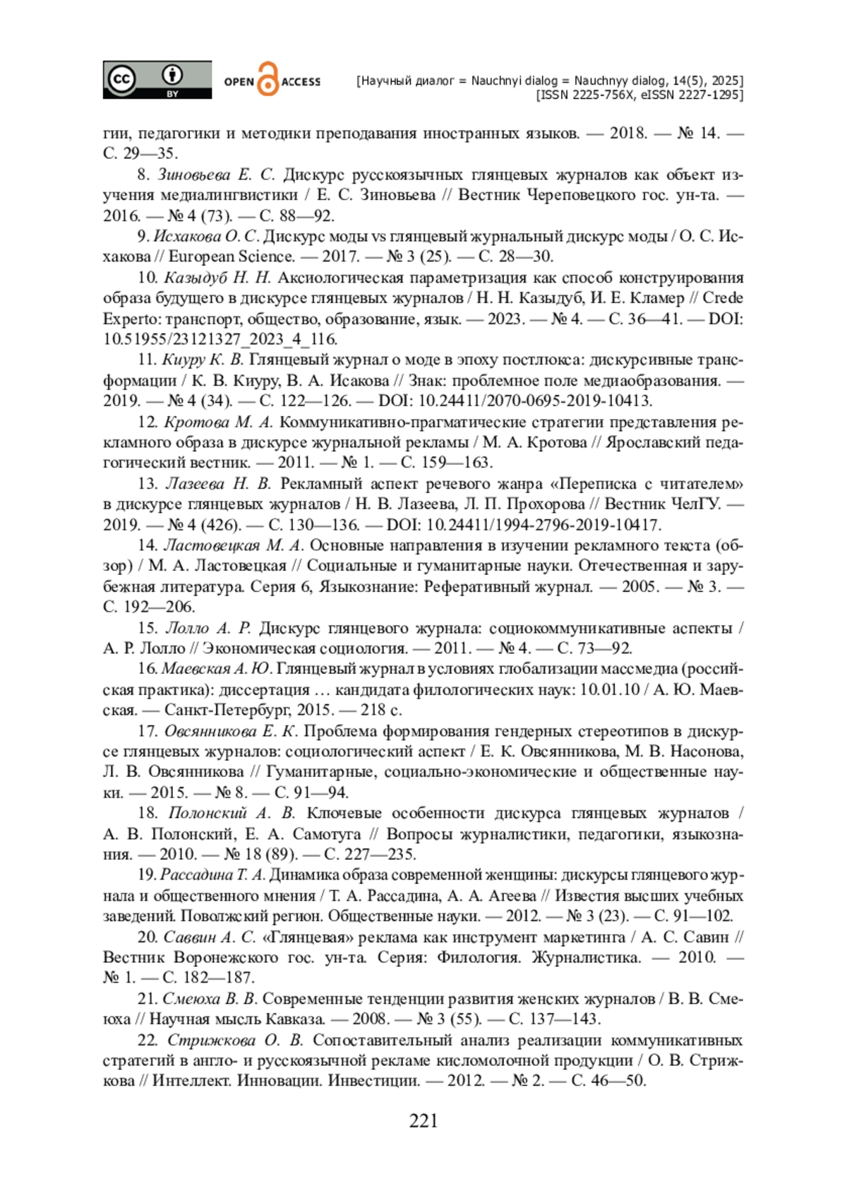 8. Зиновьева Е. С. Дискурс русскоязычных глянцевых журналов как объект изучения медиалингвистики / Е. С. Зиновьева // Вестник Череповецкого гос. ун-та. - 2016. - № 4 (73). - С. 88-92.