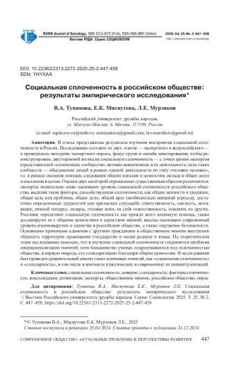 В статье представлены результаты изучения восприятия социальной сплоченности в России. Исследование состояло из двух этапов - экспертного и всероссийского - и проводилось методами экспертного опроса, фокус-групп и онлайн анкетирования, чтобы реконструировать двусторонний взгляд на социальную сплоченность - с точки зрения экспертов (представителей «сплоченных сообществ», активно вовлеченных в их деятельность; цель таких сообществ - объединение людей в рамках единой деятельности по типу «человек-человек», т. е. в рамках оказания помощи, следования общим идеалам и ценностям, вклада в общее дело) и населения в целом. Оценки двух категорий опрошенных существенным образом различаются: эксперты значительно ниже оценивают уровень социальной сплоченности российского общества, выделяя такие факторы, способствующие сплоченности, как общие ценности и традиции, общая цель или проблема, общее дело, общий враг (необязательно внешний агрессор, достаточно определенных трудностей или кризисных ситуаций); ответственность, смелость, мотивация, личный интерес; лидеры, готовые взять на себя ответственность, повлиять на других. Россияне определяют социальную сплоченность как прежде всего взаимную помощь; также ассоциируют ее с общими ценностями и единством мнений; высоко оценивают современный уровень взаимовыручки и единства в российском обществе, а также ощущение безопасности. Основными причинами единения с другими гражданами в общественном мнении выступают общность территории проживания (государство и малая родина) и языка. На теоретическом этапе исследование показало, что в изучении социальной сплоченности сохраняется проблема операционализации понятий, хотя большинство ученых подразумеваются под сплоченностью общества, в первую очередь, его солидаризацию благодаря общим ценностям. В исследовании был проведен сравнительный анализ таких ключевых понятий, как «социальная сплоченность» и «солидарность», в том числе в контексте классических и современных их концептуализаций.