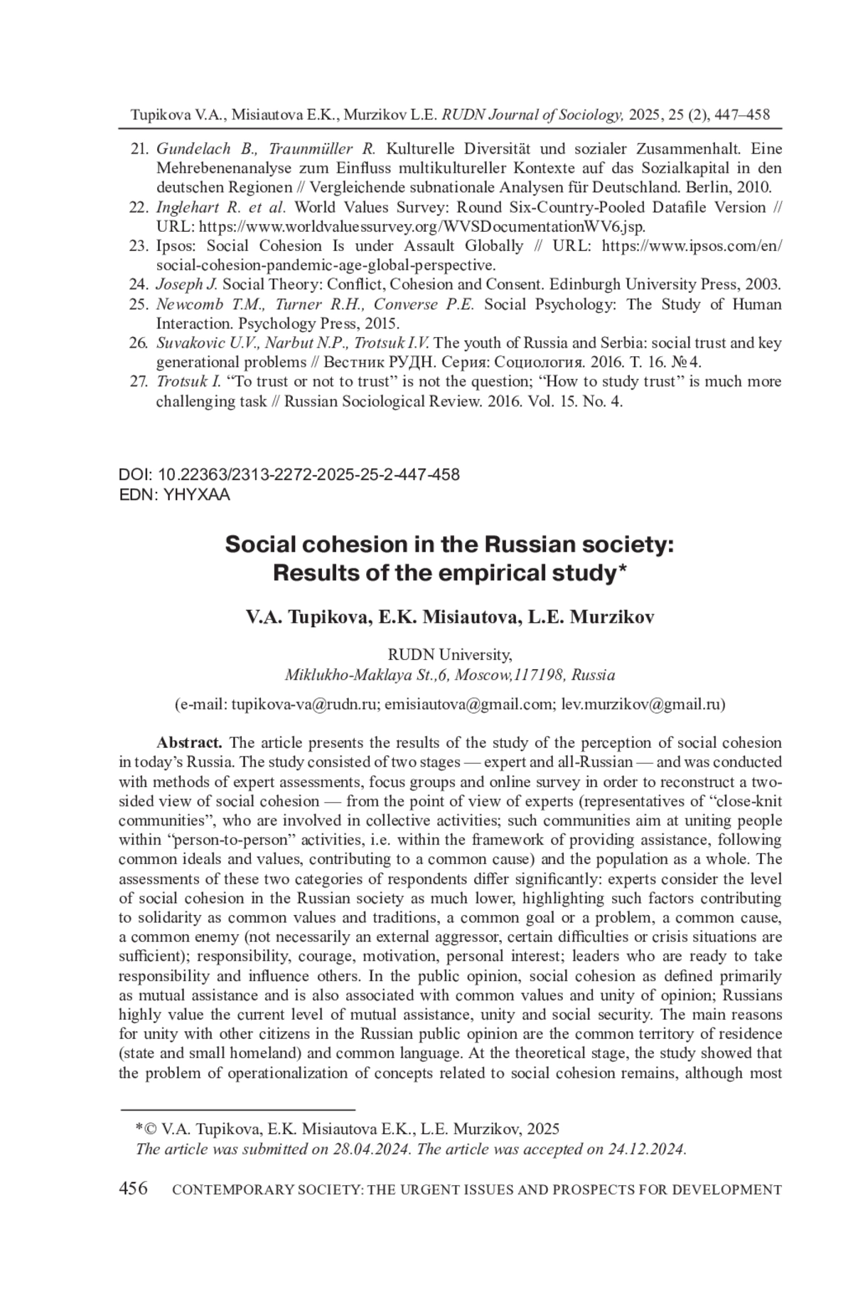 26. Suvakovic U.V., Narbut N.P., Trotsuk I.V. The youth of Russia and Serbia: social trust and key generational problems // Вестник РУДН. Серия: Социология. 2016. Т. 16. № 4.