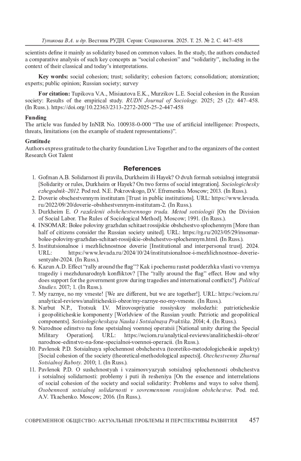 14. Сорокин П.С., Попова Т.А. Классические и современные подходы к исследованию солидарности: проблемы и перспективы в условиях деструктурации // Вестник РУДН. Серия: Социология. 2021. Т. 21. № 3.
