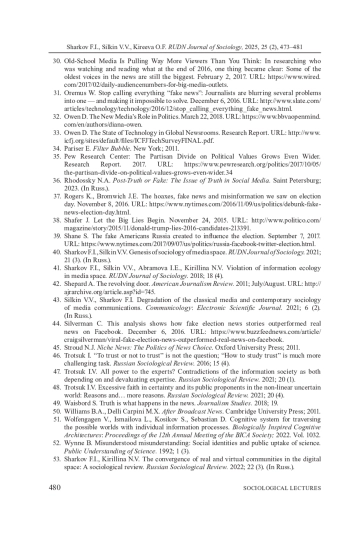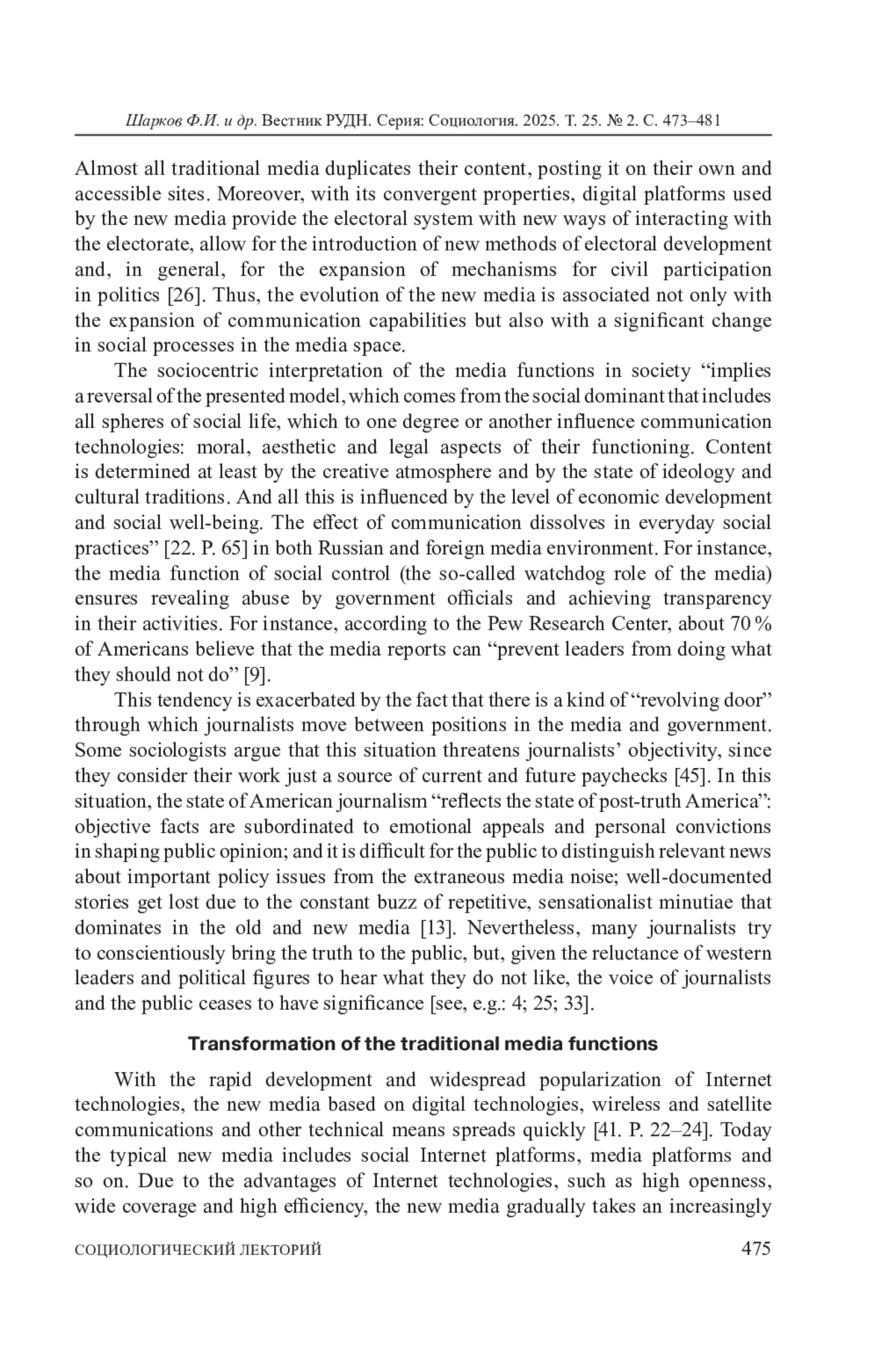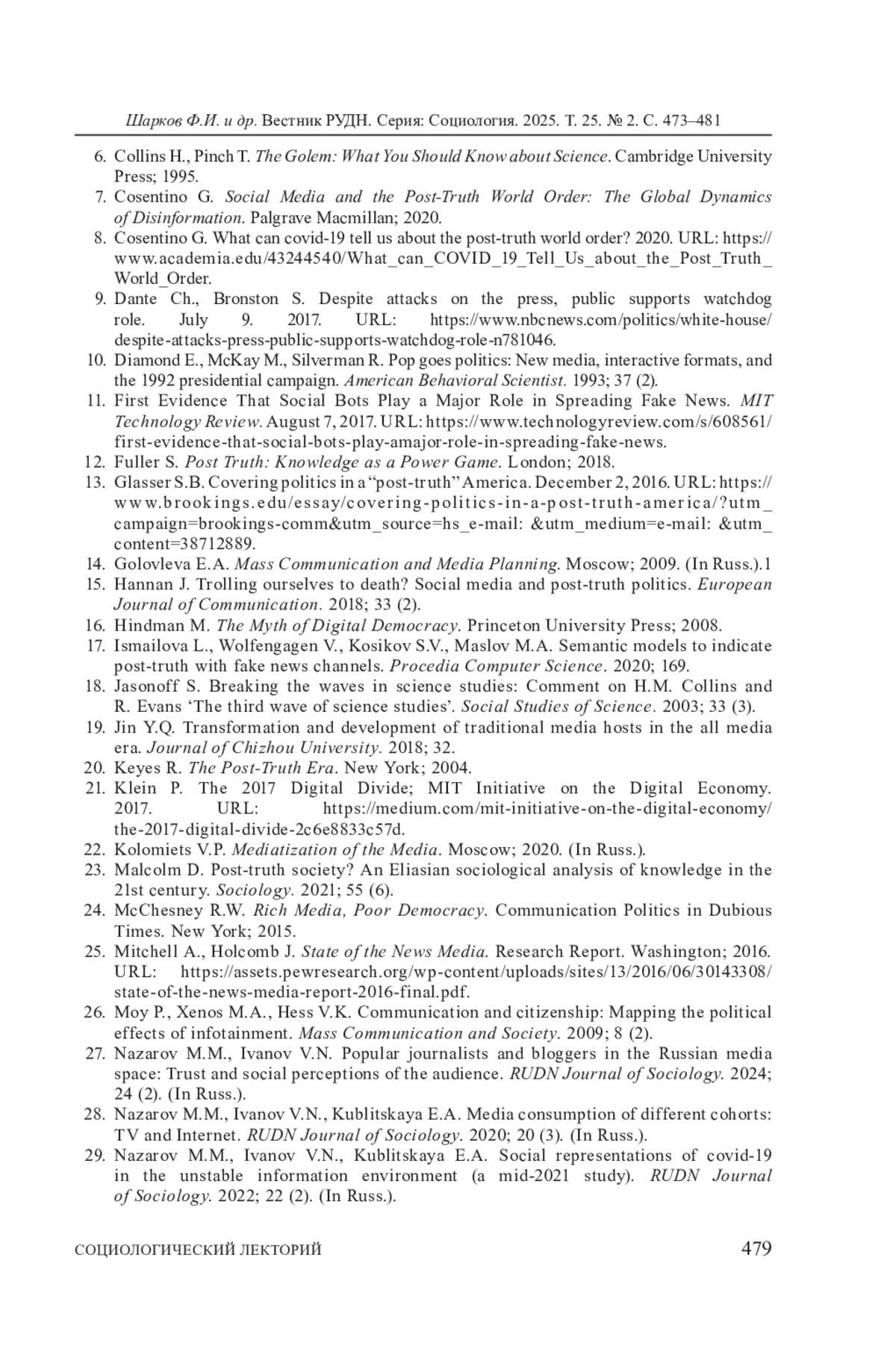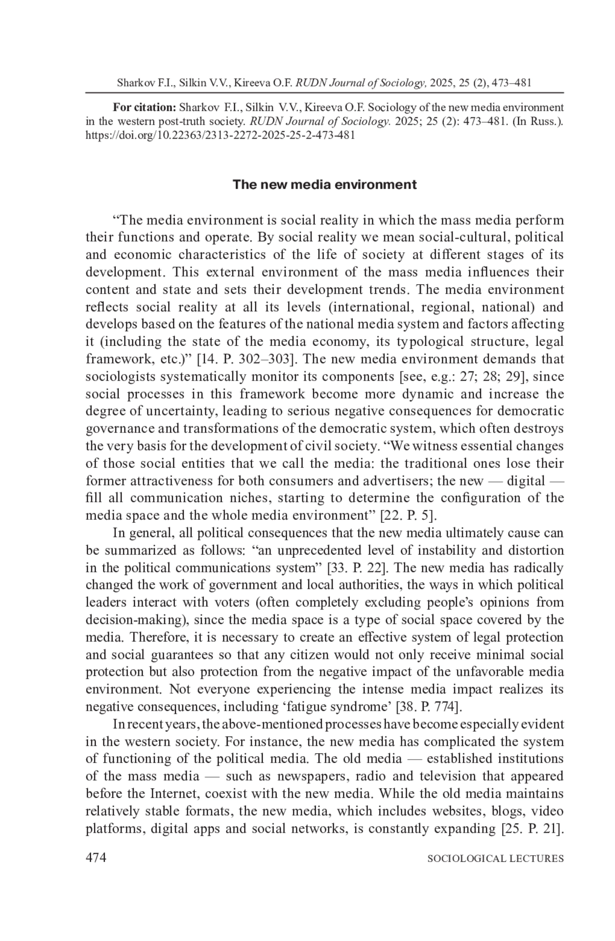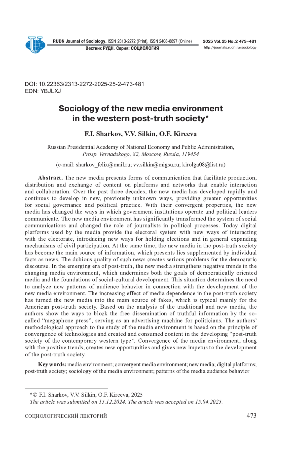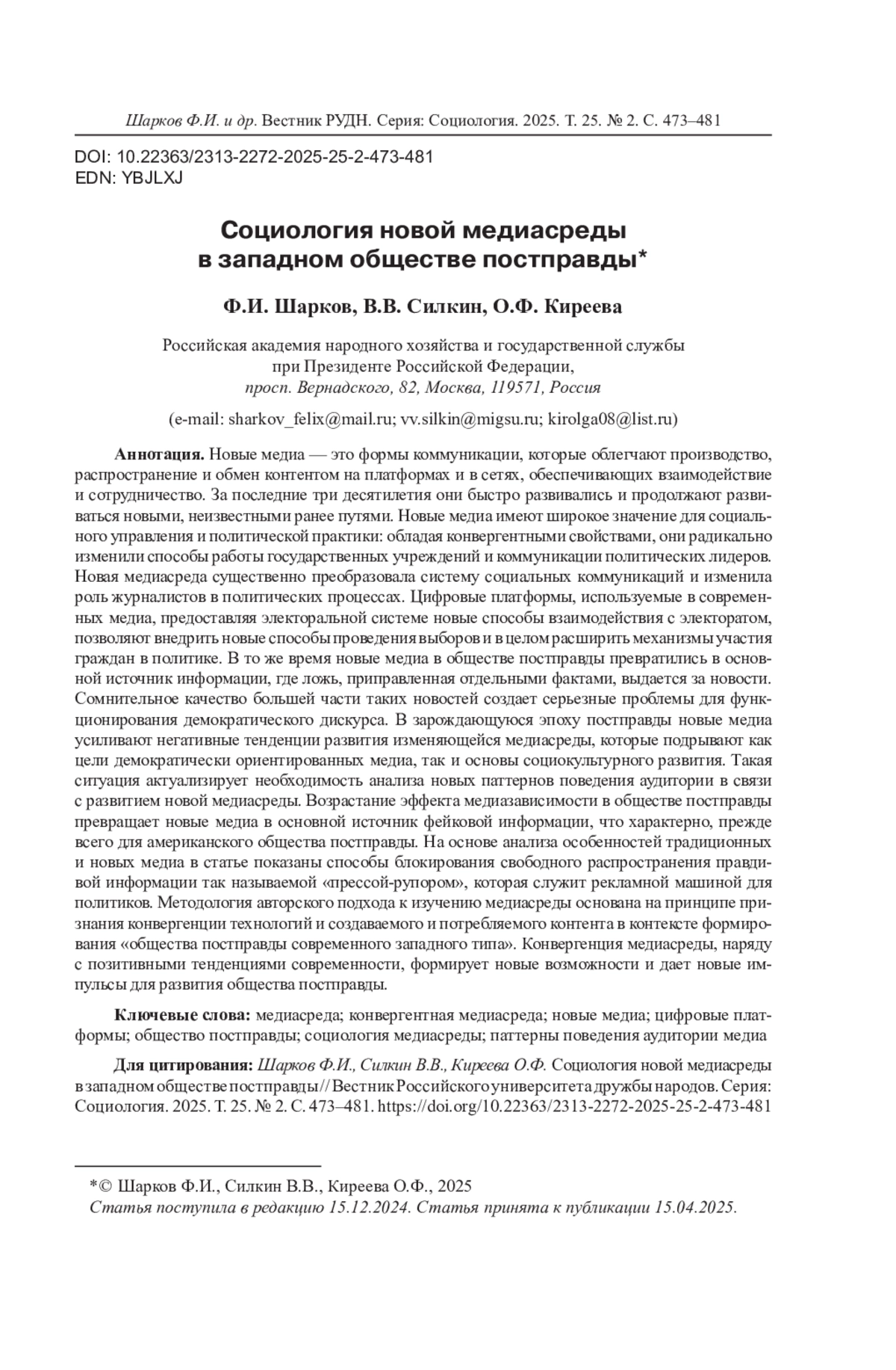 ШАРКОВ Ф. И., СИЛКИН В. В., КИРЕЕВА О. Ф. СОЦИОЛОГИЯ НОВОЙ МЕДИАСРЕДЫ В ЗАПАДНОМ ОБЩЕСТВЕ ПОСТПРАВДЫ // ВЕСТНИК РОССИЙСКОГО УНИВЕРСИТЕТА ДРУЖБЫ НАРОДОВ. СЕРИЯ: СОЦИОЛОГИЯ. 2025. Т. 25 № 2