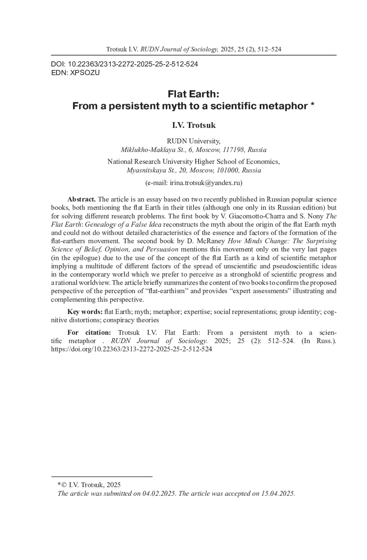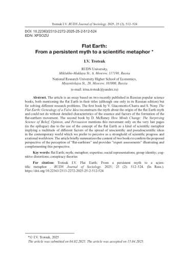 Статья представляет собой эссе по мотивам двух опубликованных недавно на русском языке научно-популярных книг, в названии каждой из которых (хотя в одной только в российском издании) упомянута плоская Земля, но для решения разных исследовательских задач. Первая книга - В. Джакомотто-Шарра и С. Нони «Земля плоская: Генеалогия ложной идеи» - посвящена реконструкции мифа об истории происхождения мифа о плоской Земле, которая по определению не могла бы обойтись без развернутых характеристик сути и факторов формирования движения плоскоземельщиков. Вторая книга - Д. Макрейни «И все-таки она плоская! Удивительная наука о том, как меняются убеждения, верования и мнения» - упоминает это движение лишь на самых последних страницах (в эпилоге), поскольку использует понятие плоской Земли как своего рода научную метафору, за которой скрывается множество разнообразных факторов распространения ненаучных и лженаучных идей в современном мире, который мы привыкли воспринимать как оплот достижений научного прогресса и рационального мировоззрения. В статье содержание двух книг кратко суммировано для подтверждения предлагаемой перспективы восприятия «плоскоземельности», и приведены иллюстрирующие и дополняющие эту перспективу «экспертные оценки».