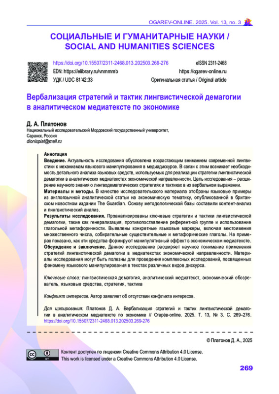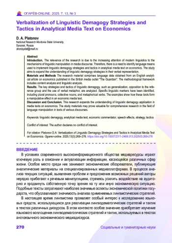 Введение. Актуальность исследования обусловлена возрастающим вниманием современной лингвистики к механизмам языкового манипулирования в медиадискурсе. В связи с этим возникает необходимость детального анализа языковых средств, используемых для реализации стратегии лингвистической демагогии в аналитических медиатекстах экономической направленности. Цель исследования – расширение научного знания о лингводемагогических стратегиях и тактиках в их вербальном выражении.