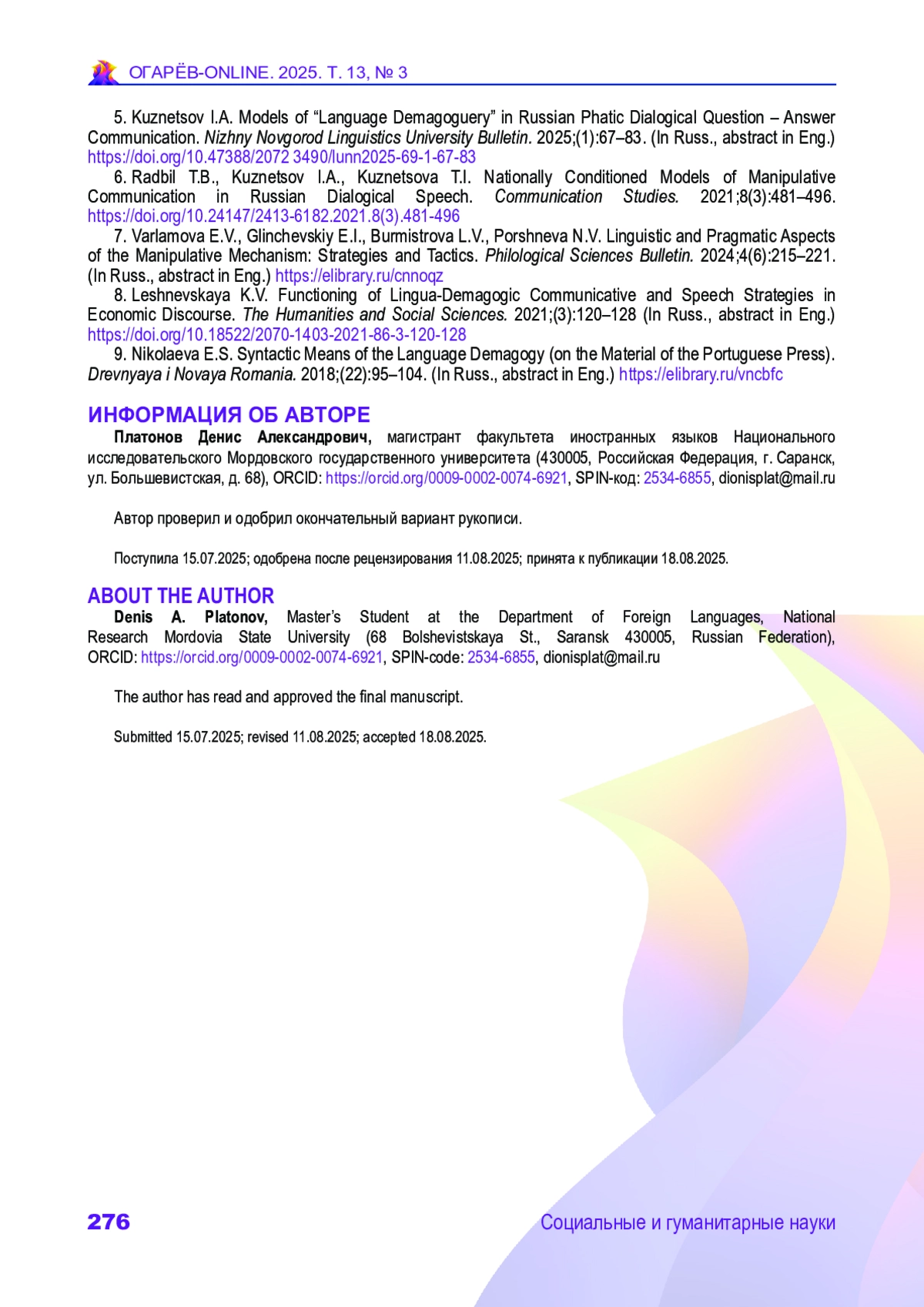 5. Кузнецов И. А. Модели языковой демагогии в русскоязычной фатической диалогической вопросно-ответной коммуникации // Вестник Нижегородского государственного лингвистического университета им. Н. А. Добролюбова. 2025. № 1. С. 67-83. DOI: 10.47388/2072-3490/lunn2025-69-1-67-83