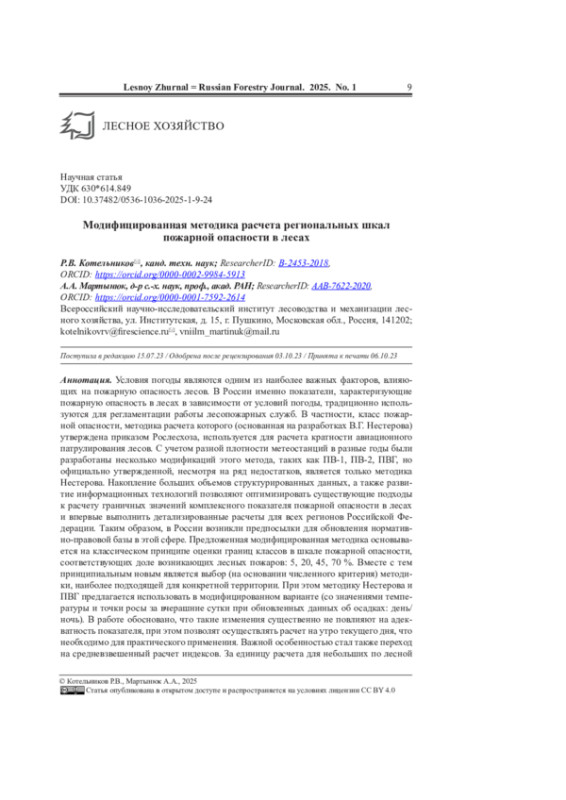 4. Котельников Р.В., Чугаев А.Н. Сравнительная оценка качества индексов пожарной опасности в лесах // Сиб. лесн. журн. 2023. No 6. С. 32-38. EDN: MJAZUV