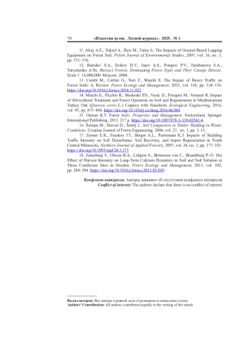 11. Akay A.E., Yuksel A., Reis M., Tutus A. The Impacts of Ground-Based Logging Equipment on Forest Soil. Polish Journal of Environmental Studies, 2007, vol. 16, no. 3, pp. 371-376.