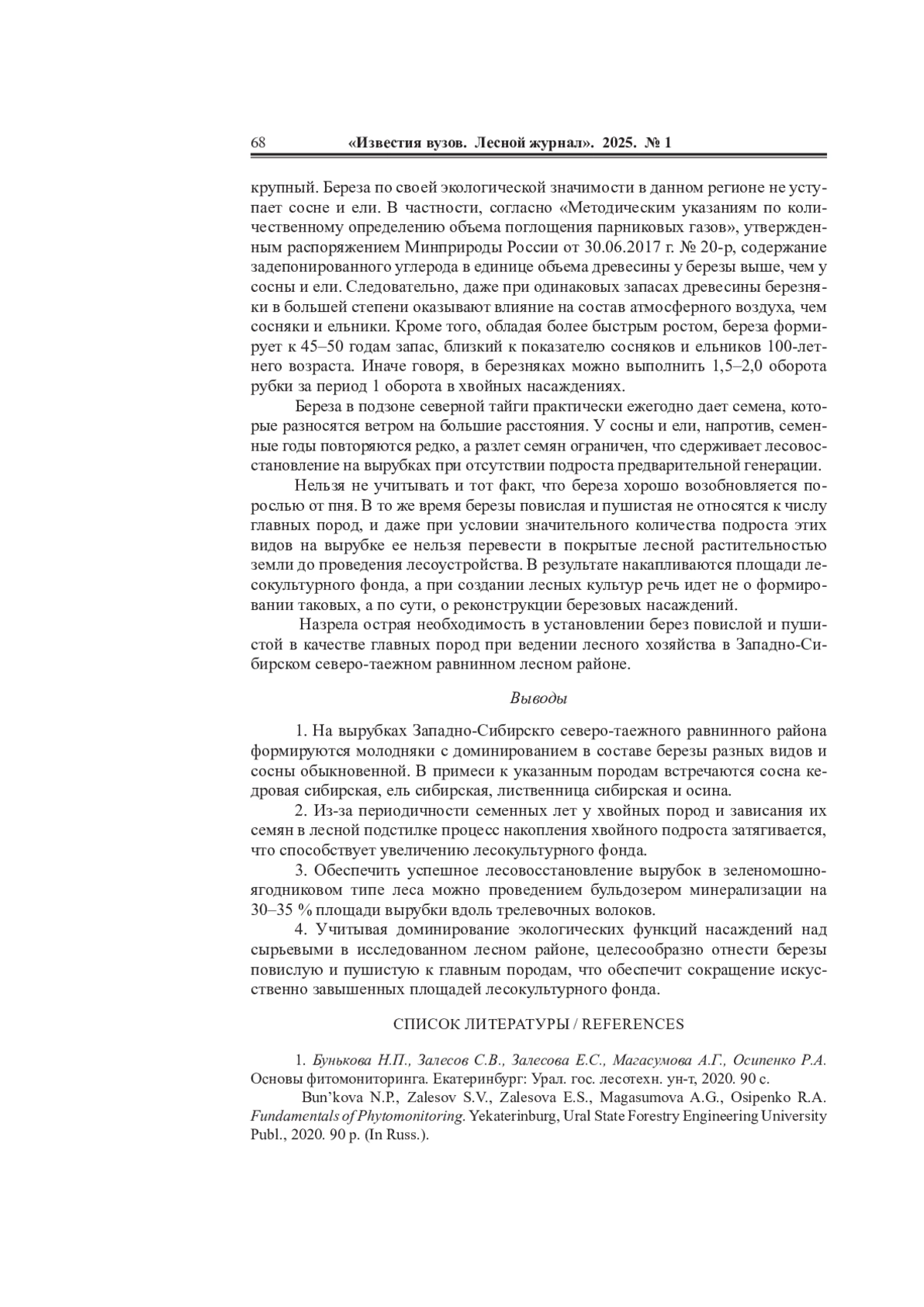 1. Бунькова Н.П., Залесов С.В., Залесова Е.С., Магасумова А.Г., Осипенко Р.А. Основы фитомониторинга. Екатеринбург: Урал. гос. лесотехн. ун-т, 2020. 90 с.