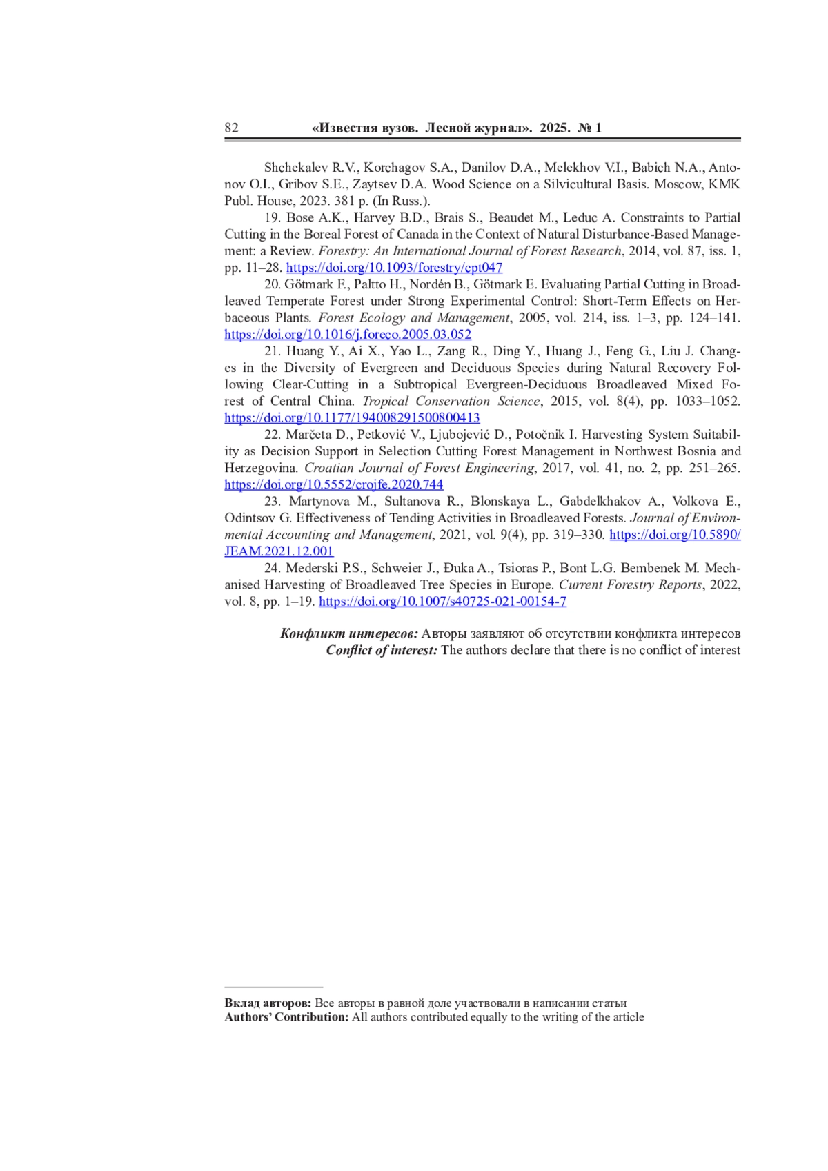 24. Mederski P.S., Schweier J., Đuka A., Tsioras P., Bont L.G. Bembenek M. Mechanised Harvesting of Broadleaved Tree Species in Europe. Current Forestry Reports, 2022, vol. 8, pp. 1-19. DOI: 10.1007/s40725-021-00154-7