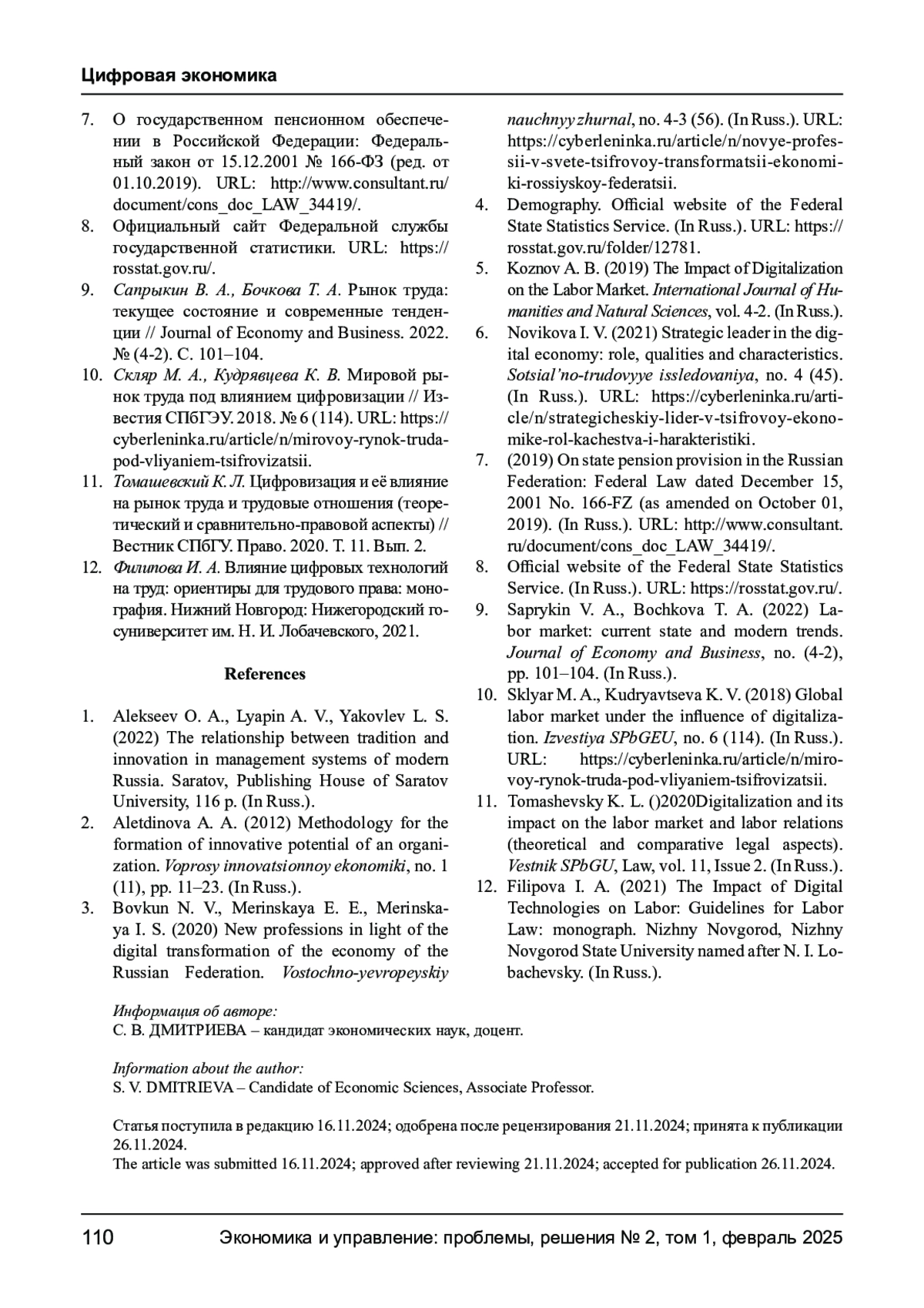 3. Бовкун Н. В., Меринская Е. Е., Меринская И. С. Новые профессии в свете цифровой трансформации экономики российской федерации // Восточно-европейский научный журнал. 2020. № 4-3 (56). URL: https://cyberleninka.ru/article/n/novye-professii-v-svete-tsifrovoy-transformatsii-ekonomiki-rossiyskoy-federatsii.