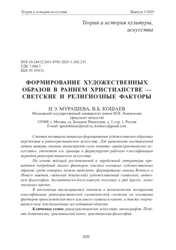 Статья посвящена вопросам формирования художественно-образных перспектив в раннехристианском искусстве. Для выполнения поставленной задачи авторы статьи анализируют само понятие «раннехристианское искусство», уточняют его границы и формулируют рабочую классификацию периодов раннехристианского искусства. На основе ведущей русскоязычной и зарубежной литературы проводится подробный анализ факторов генезиса основных художественных образов, среди которых можно выделить: формирование канона Ветхого и Нового заветов, светский (языческий) художественный символизм, античную философию, догматически-богословскую полемику и ряд других, менее значимых причин. В заключении высказывается гипотеза о возможности построения классификации раннехристианской символической системы на основании факторов происхождения того или иного символа в каноне, а также очерчивается поле для дальнейших исследований области.