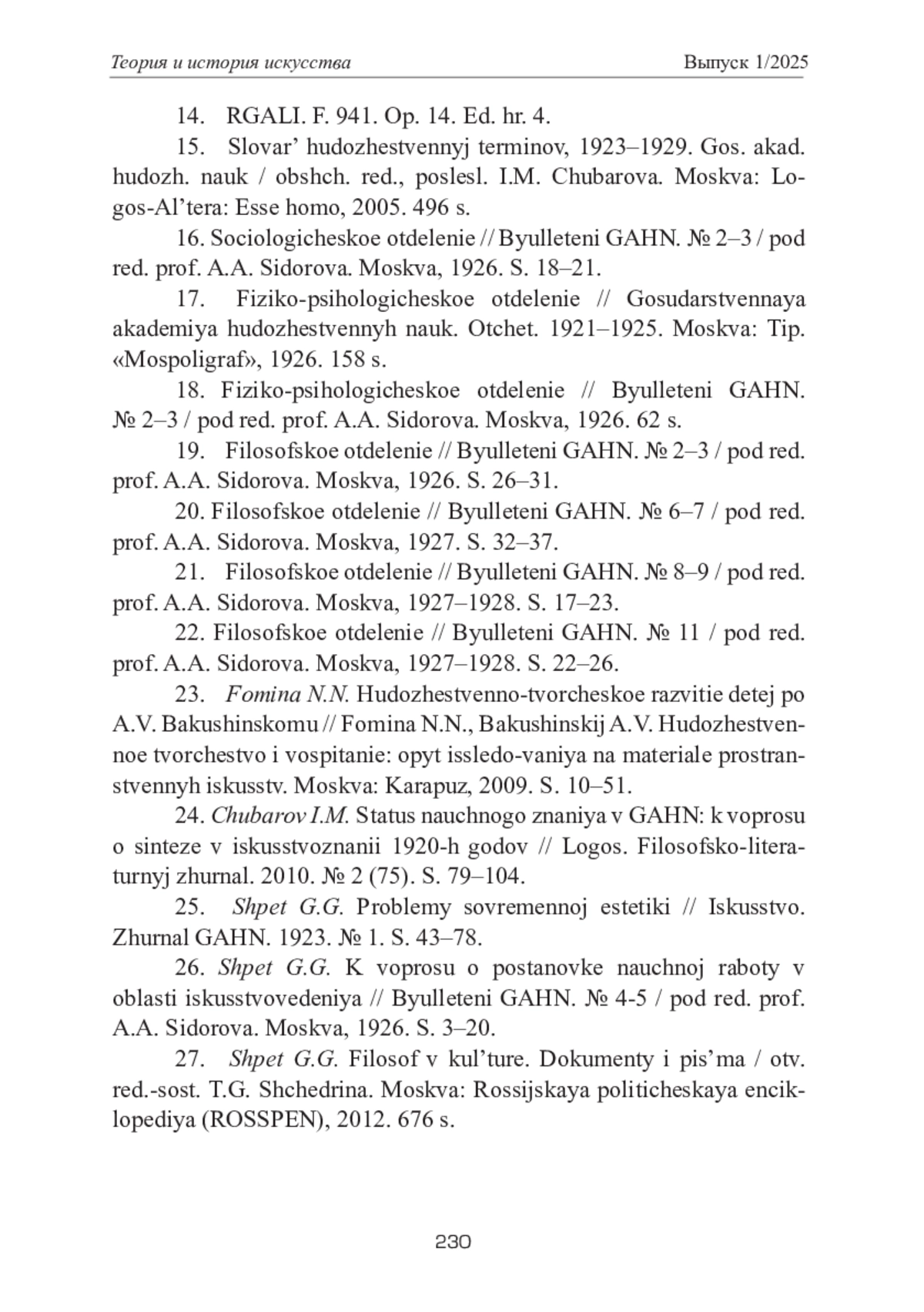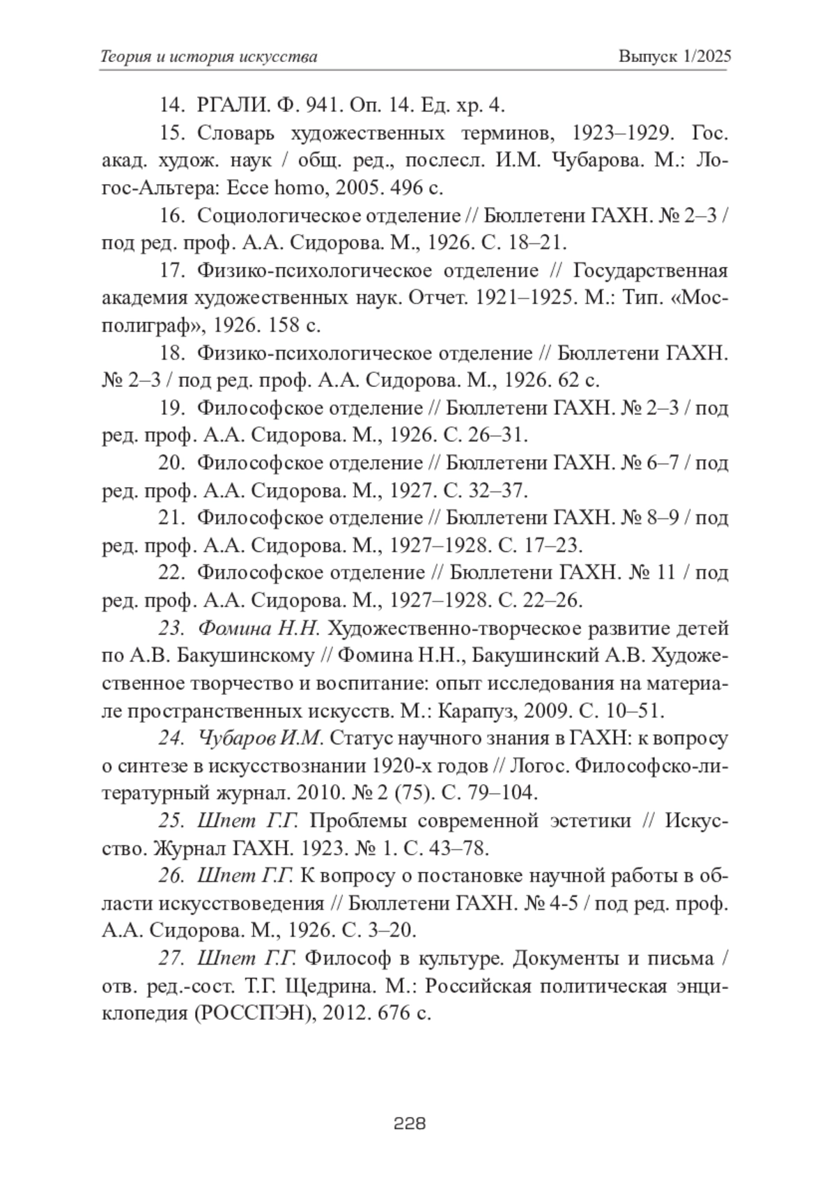 25. Шпет Г.Г. Проблемы современной эстетики // Искусство. Журнал ГАХН. 1923. № 1. С. 43-78.