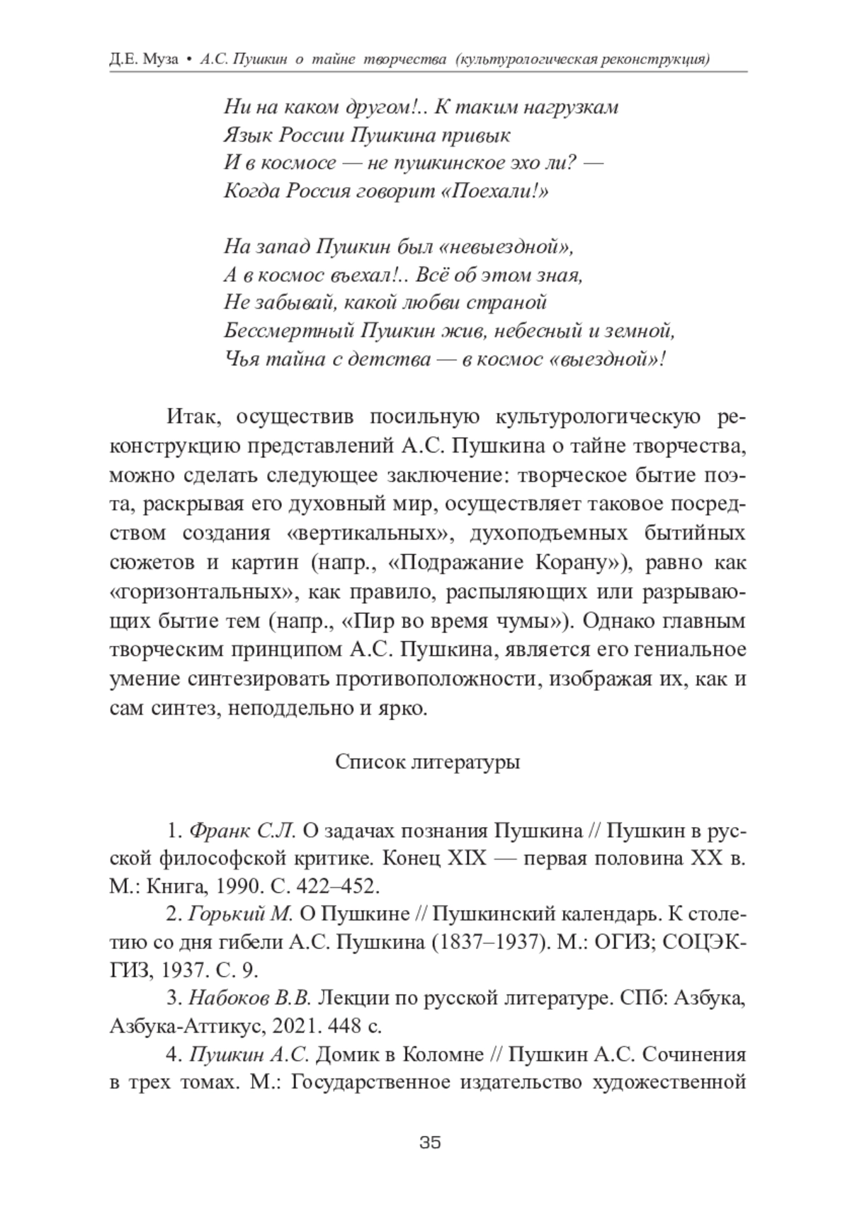 1. Франк С.Л. О задачах познания Пушкина // Пушкин в русской философской критике. Конец XIX - первая половина ХХ в. М.: Книга, 1990. С. 422-452.