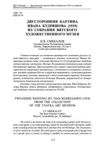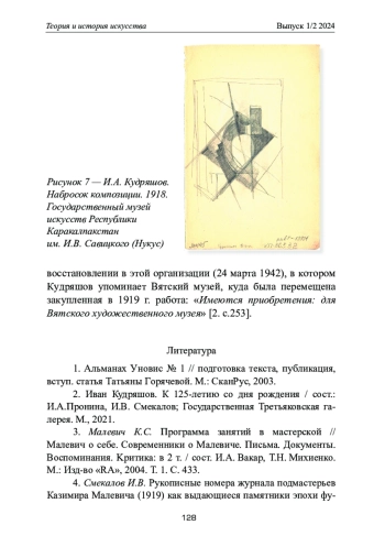 Искусство живописца Ивана Алексеевича Кудряшова (Кудряшева) (1896–1972) только в наши дни раскрывается перед исследователями во всей полноте. В 2011–2014 гг. удалось уточнить атрибуцию самых известных супрематистских произведений мастера, происходящих из коллекции Г. Д. Костаки [2, c. 40–45]. Весной 2021 г. открылась выставка «Иван Кудряшов. К 125-летию со дня рождения», объединившая крупнейшие музеи России, а также Центр Помпиду (Париж, Франция) и Государственный музей современного искусства — коллекция Костаки (Салоники, Греция). На выставке был впервые введен в научный обиход масштабный фонд произведений художника, хранящихся в Государственном музее искусств Республики Каракалпакстан им. И. В. Савицкого (Нукус). В процессе осмысления выставки раскрываются новые, часто неожиданные аспекты драматичной истории русского художественного авангарда.