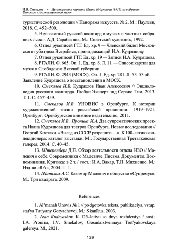 12. Смекалов И.В., Пронина И.А. Два супрематических проекта Ивана Кудряшова для театров Оренбурга. Новые исследования // Георгий Костаки. “Выезд из СССР разрешить…”. К 100-летию коллекционера: каталог выставки. М.: Государственная Третьяковская галерея, 2014. С. 40-45.