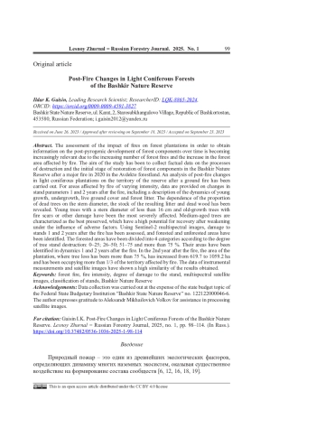 Оценка воздействия пожаров на лесные насаждения для получения информации о постпирогенном развитии компонентов леса в динамике становится все более актуальной в связи с возрастанием количества возгораний лесов и пройденной огнем лесной площади. Цель исследования - сбор фактических данных о процессах деструкции и начальной стадии восстановления компонентов леса в Башкирском заповеднике после крупного пожара 2020 г. в массиве Авдэктэ. Выполнен анализ послепожарных изменений светлохвойных насаждений на территории заповедника после низового пожара. Для участков, пройденных огнем различной интенсивности, приводятся данные по изменению показателей древостоев через 1 и 2 года после пожара, в т. ч. описана динамика подроста, подлеска, живого напочвенного покрова, лесной подстилки. Выявлена зависимость доли погибших деревьев от диаметра ствола, запаса образовавшейся захламленности и сухостоя. Наиболее сильно пострадали молодняк с диаметром ствола менее 16 см и старовозрастные деревья, имеющие пожарные подсушины или другие повреждения. Как самые сохранившиеся характеризуются средневозрастные деревья, которые обладают высоким потенциалом восстановления после ослабления под воздействием неблагоприятных факторов. По мультиспектральным снимкам Sentinel-2 проведена оценка повреждения древостоев через 1 и 2 года после пожара, выделены покрытые и непокрытые лесом участки. Покрытые лесом участки были разделены по степени гибели древостоев на 4 категории: 0-25; 26-50; 51-75 и более 75 %. Выявлены их площади в динамике через 1 и 2 года после пожара. На 2-й год после пожара площадь насаждения, где гибель деревьев составляет более 75 %, увеличилась с 619,7 до 1059,2 га и занимала более 1/3 территории, пройденной огнем. Данные инструментальных измерений и спутниковых снимков показали высокое сходство полученных результатов.