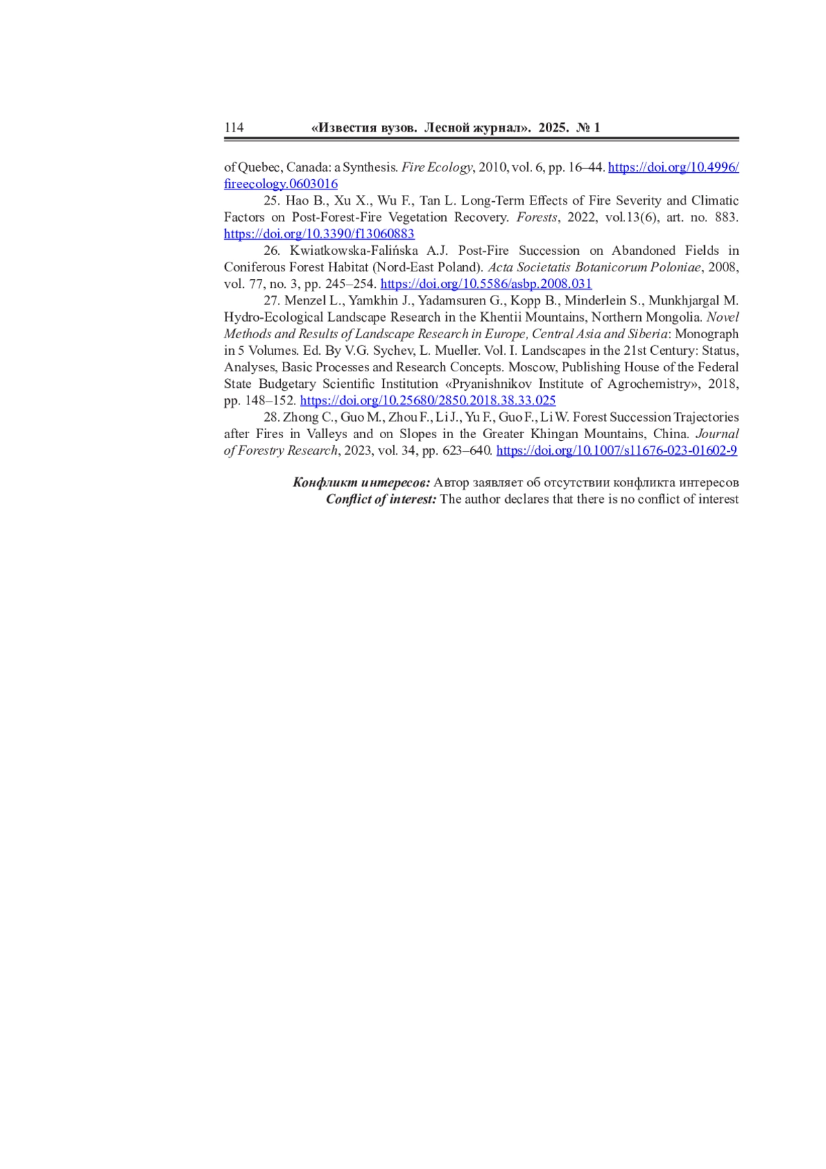 28. Zhong C., Guo M., Zhou F., Li J., Yu F., Guo F., Li W. Forest Succession Trajectories after Fires in Valleys and on Slopes in the Greater Khingan Mountains, China. Journal of Forestry Research, 2023, vol. 34, pp. 623-640. DOI: 10.1007/s11676-023-01602-9 EDN: OKKHQO