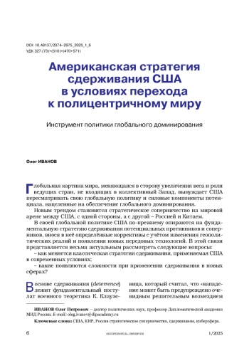 Автор рассматривает концептуальные основы и особенности реализации американской классической стратегии сдерживания в условиях разворачивающегося стратегического соперничества между США и КНР. Руководство США переносит акцент с конфликтов низкой интенсивности и гибридных конфликтов на межгосударственный, в частности на вероятный с КНР, где сдерживание играет ключевую роль. Особое внимание уделяется возможности применения сдерживания в киберсфере.