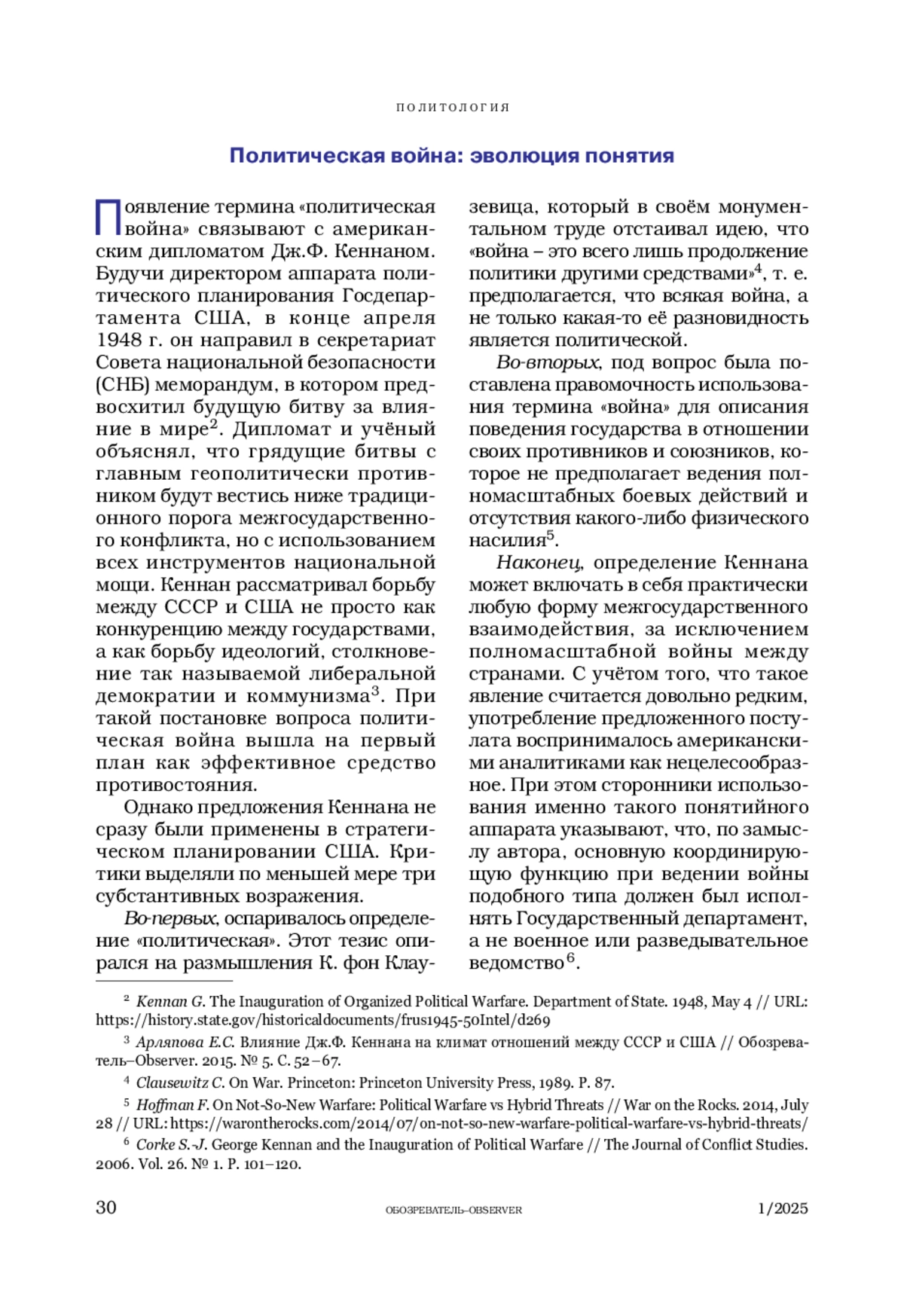 5. Corke S.-J. George Kennan and the Inauguration of Political Warfare // The Journal of Conflict Studies. Vol. 26. № 1. Summer 2006. P. 101-120.