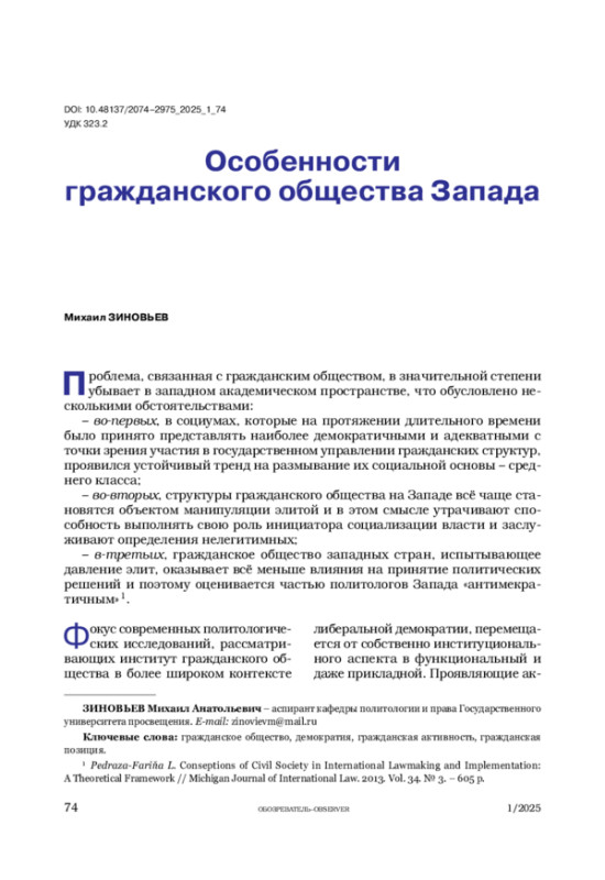 В статье представлен авторский взгляд на особенности гражданского общества в западном цивилизационном пространстве. Универсальные характеристики, содержащиеся в теории политологии, не в полной мере описывают этот феномен. Автор попытался восполнить пробел в конкретном контексте определения западного гражданского общества.