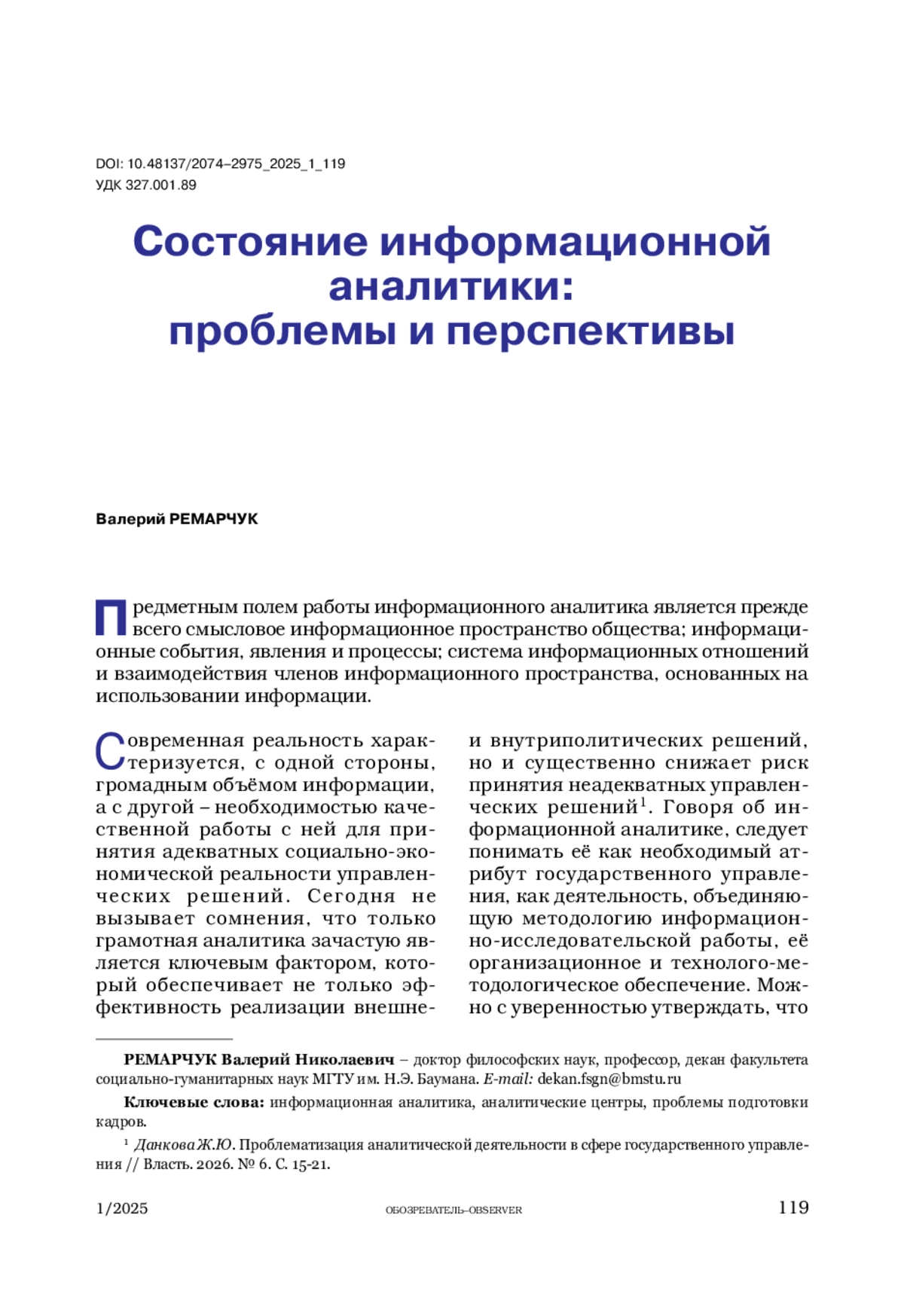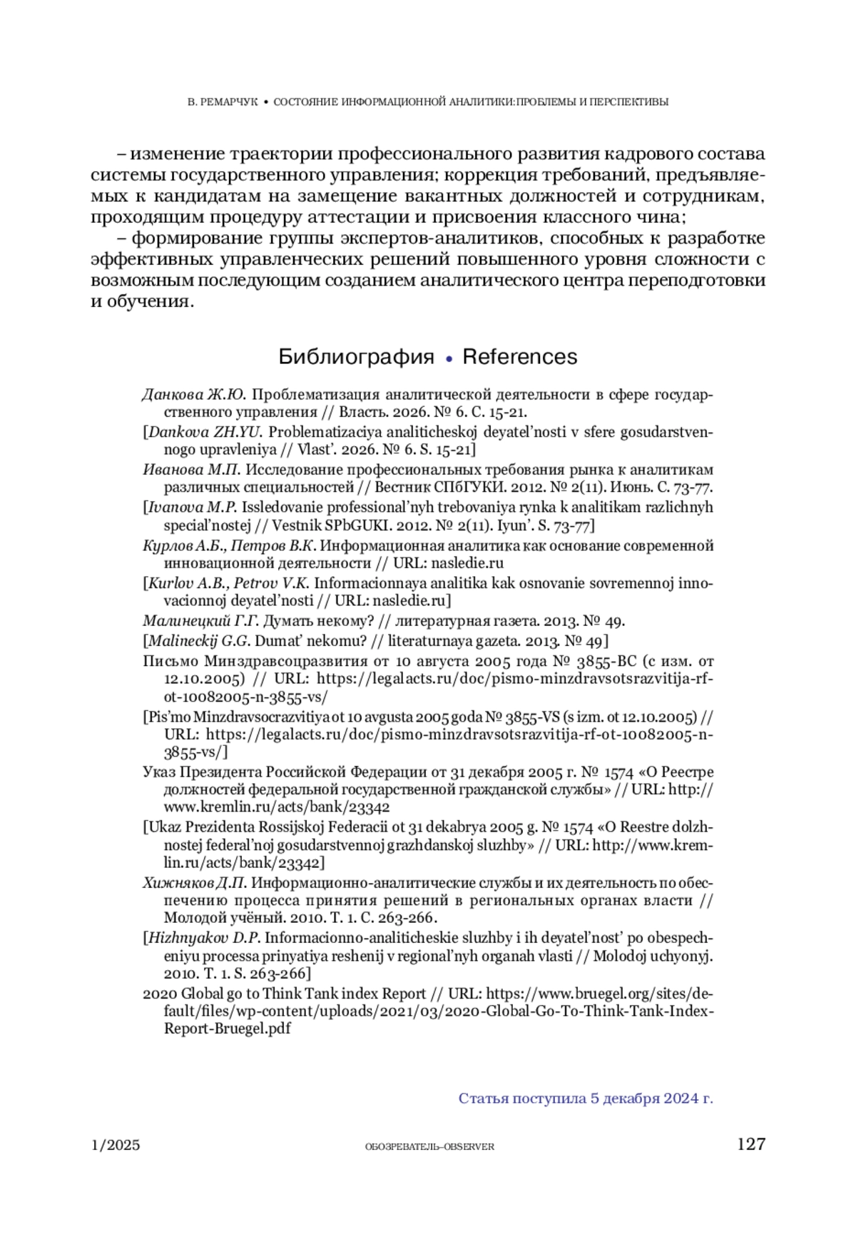 1. Данкова Ж.Ю. Проблематизация аналитической деятельности в сфере государственного управления // Власть. 2026. № 6. С. 15-21.