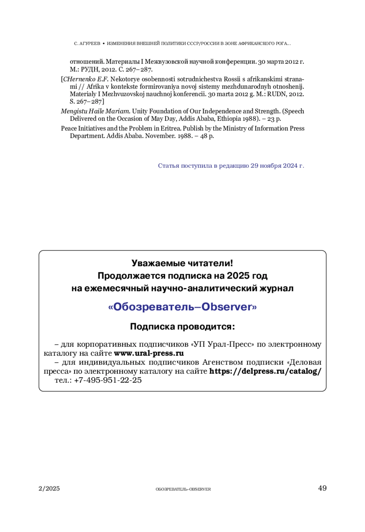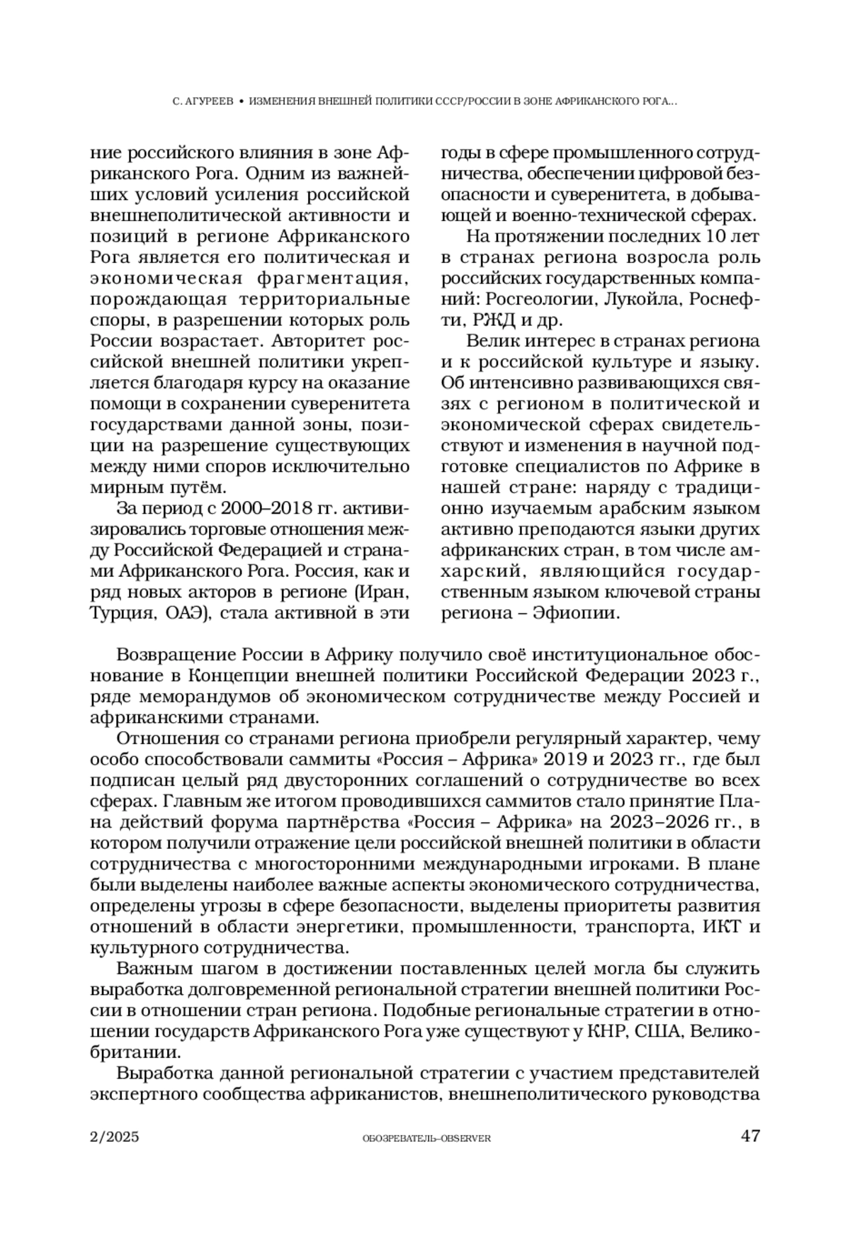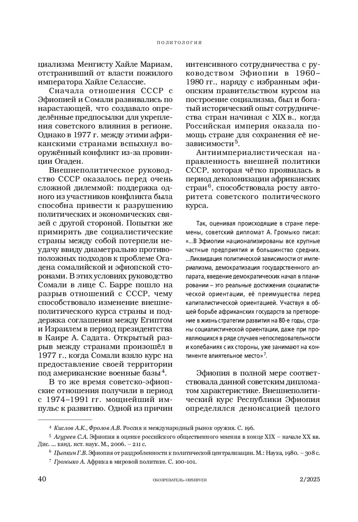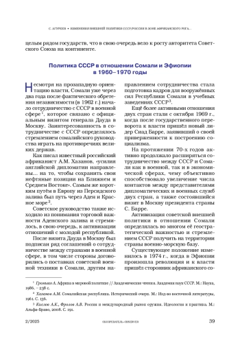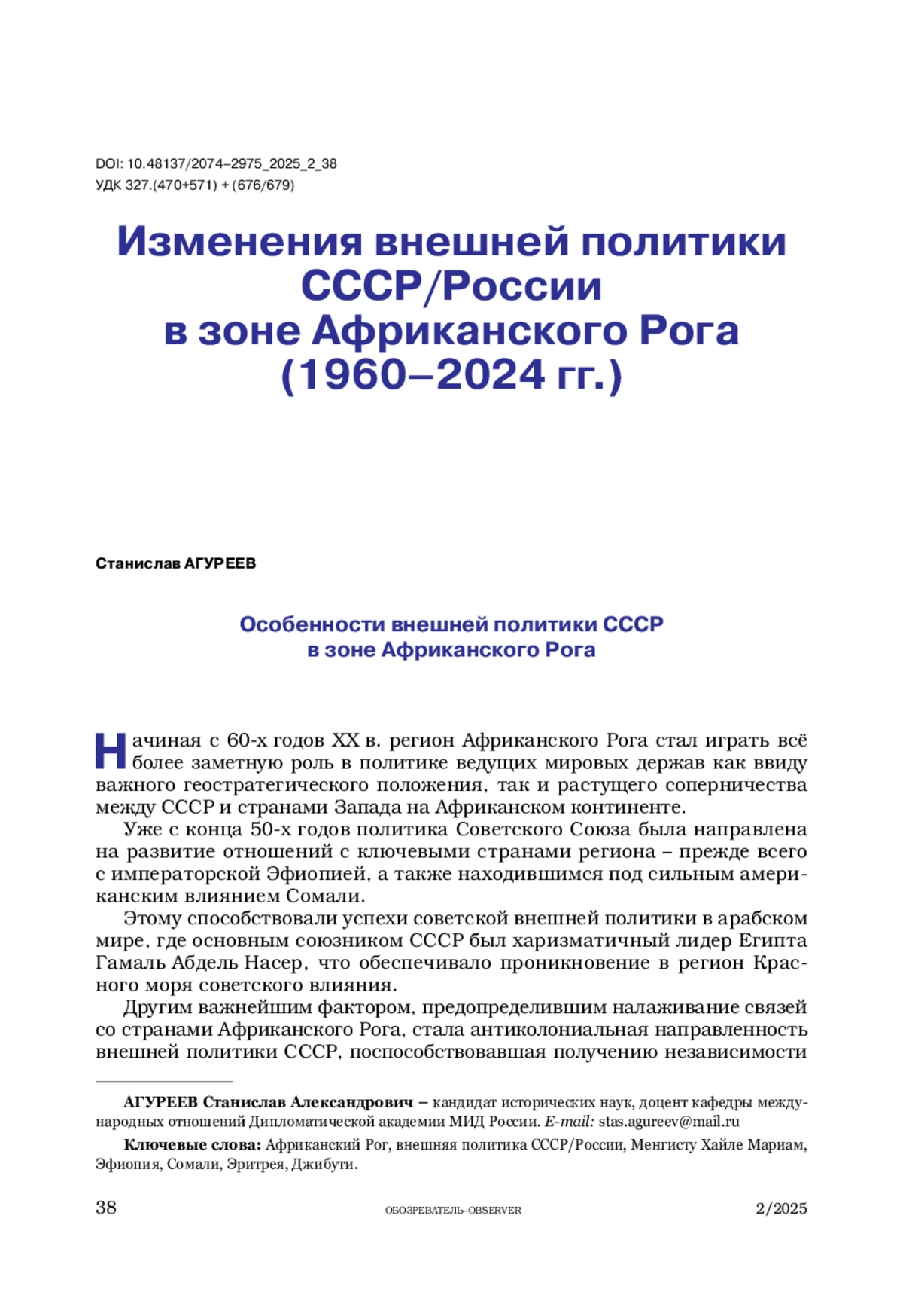 Автор рассматривает трансформацию внешней политики СССР/ России в зоне Африканского Рога начиная с 60-х годов. Причинами изменения внешнеполитических подходов СССР/России являлось не только развитие политической ситуации в регионе, но и смена политического вектора в СССР/России.