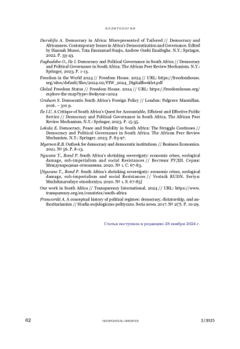 14. Fagbadebo O., Ile I. Democracy and Political Governance in South Africa // Democracy and Political Governance in South Africa. The African Peer Review Mechanism. N.Y.: Springer, 2023. P. 1-13.