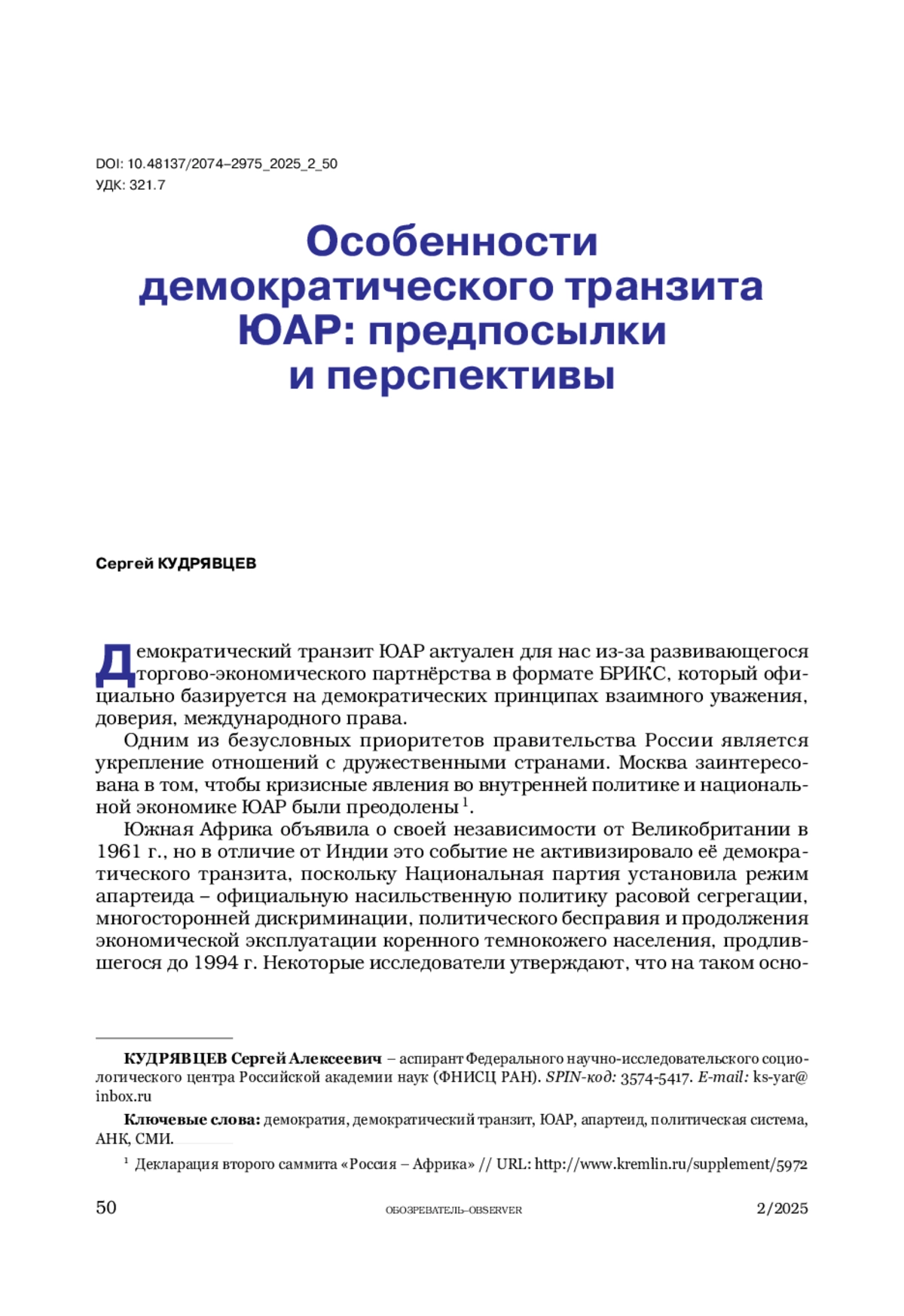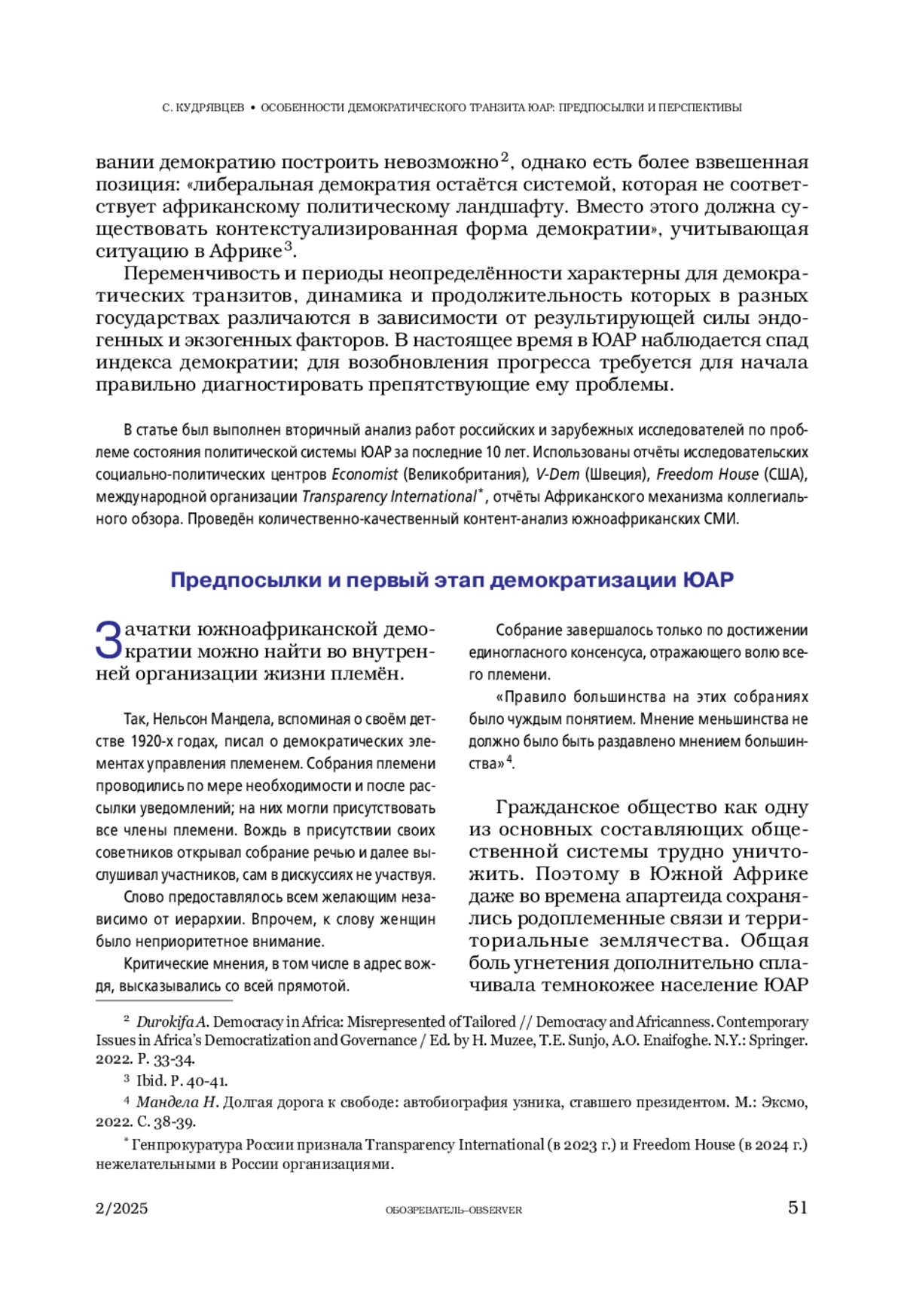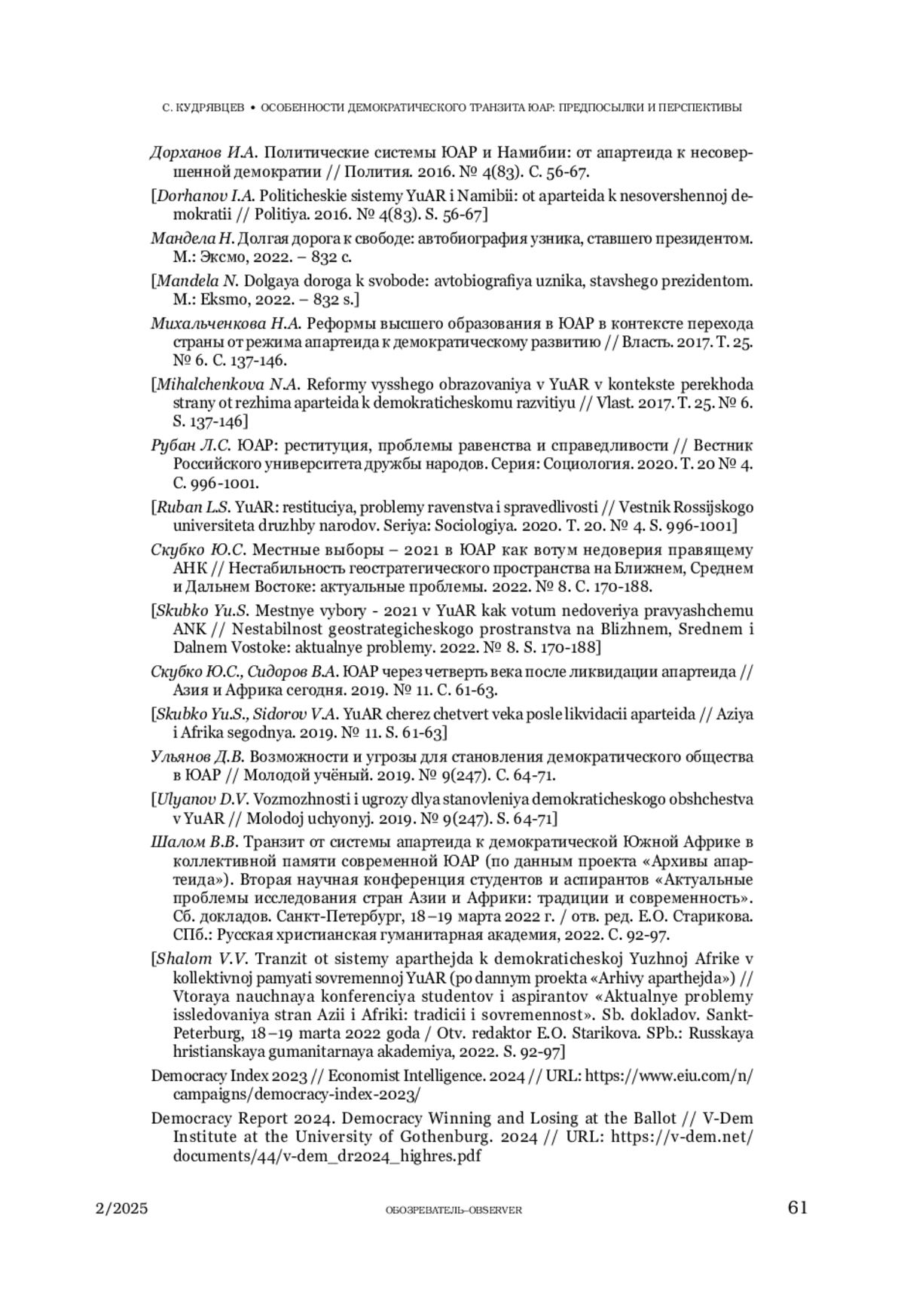 8. Скубко Ю.С., Сидоров В.А. ЮАР через четверть века после ликвидации апартеида // Азия и Африка сегодня. 2019. № 11. С. 61-63.