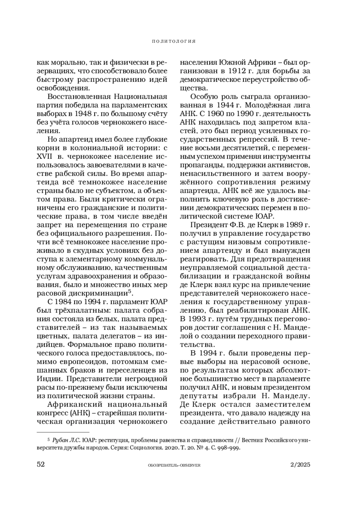 6. Рубан Л.С. ЮАР: реституция, проблемы равенства и справедливости // Вестник Российского университета дружбы народов. Серия: Социология. 2020. Т. 20 № 4. С. 996-1001.