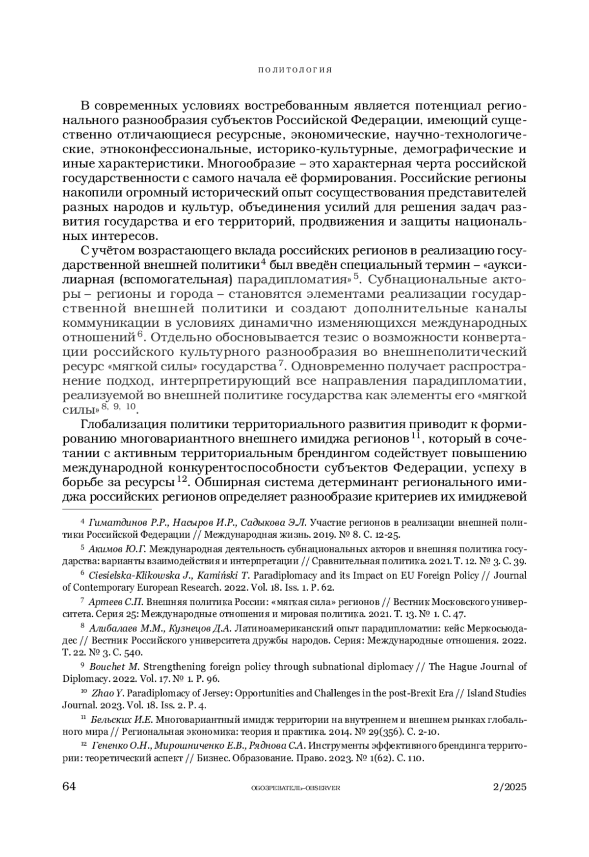 3. Артеев С.П. Внешняя политика России: «мягкая сила» регионов. // Вестник Московского университета. Серия 25. Международные отношения и мировая политика. 2021. Т. 13. № 1. С. 32-57.