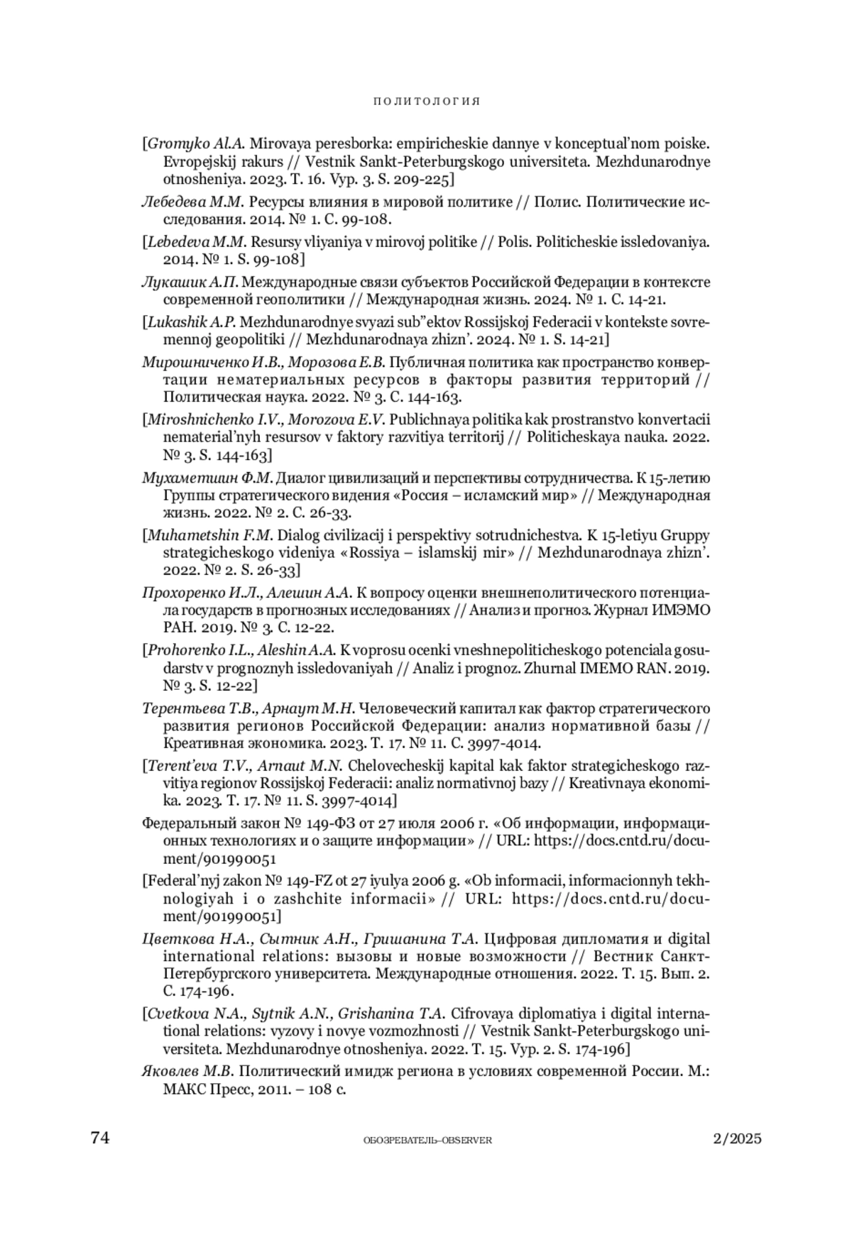 9. Лукашик А.П. Международные связи субъектов Российской Федерации в контексте современной геополитики // Международная жизнь. 2024. № 1. С. 14-21.