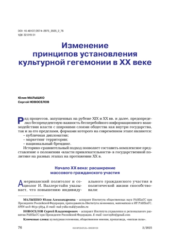 В статье анализируется эволюция концепции «власти привлекательности» в государственной политике на протяжении ХХ в., прослеживается её взаимосвязь с развитием массовой коммуникации, расширением гражданского участия и идеологическими противостояниями. Особое внимание уделяется американскому опыту в сфере публичной дипломатии, а также трансформации пропагандистских стратегий от прямого идеологического воздействия к более тонким формам «мягкой силы.